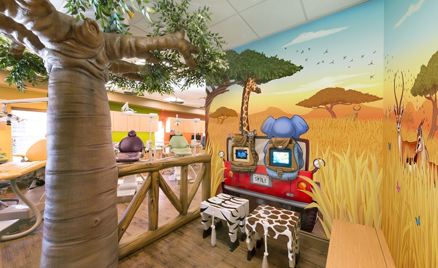As a pediatric dental specialist, Dr. Russo was able to create an amazing environment throughout her entire practice with Imagination Design Studios (IDS). Her fun safari theme is carried through the entire office, from the reception desk to the waiting area, to the treatment bay and post-op room, creating a fun and immersive experience for patients, parents, and staff alike.