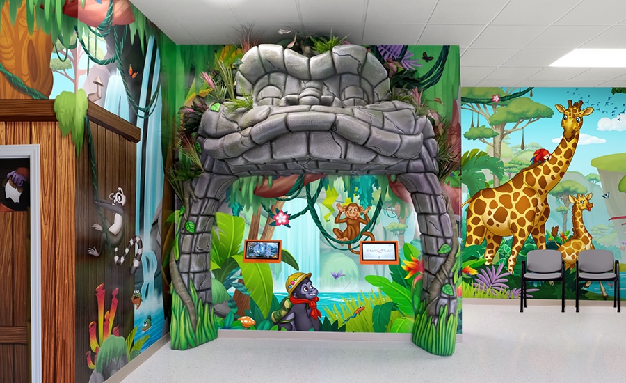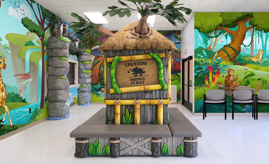 Because this was a new build, the IDS theming budget was included in the overall construction plan from the start, allowing seamless coordination with the architect and builder. Our concept artists created mood boards and sketches blending safari realism with bright, child-friendly colors. The interior decorator added finishing touches—such as tiled accents on the front desk—to complete the cohesive safari look. The result is a welcoming, unified environment that feels like an adventure from the moment patients walk in.