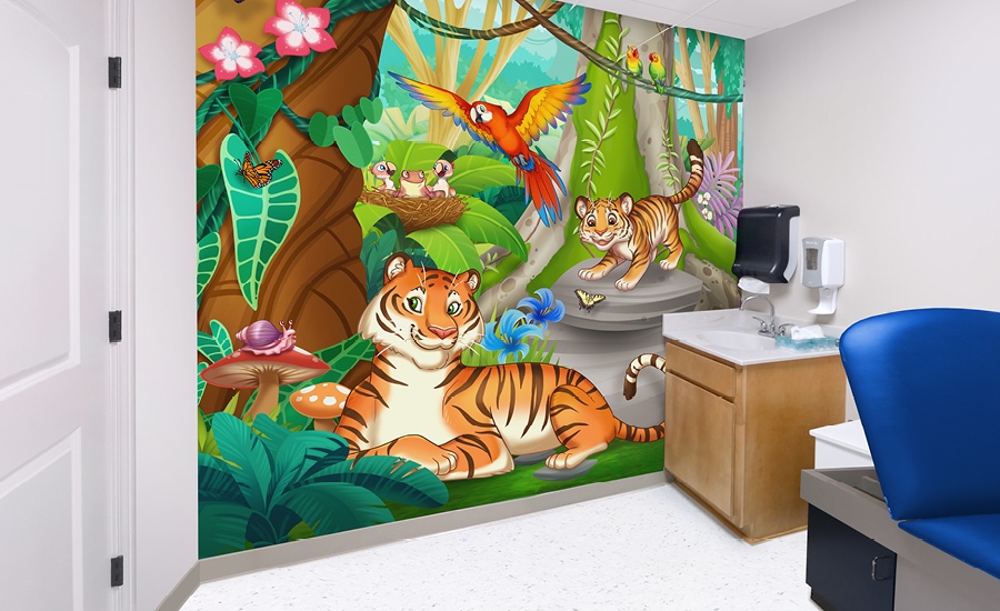 - Reception Area – jungle landscape murals around the entire waiting area, outhouse mural bathroom doors