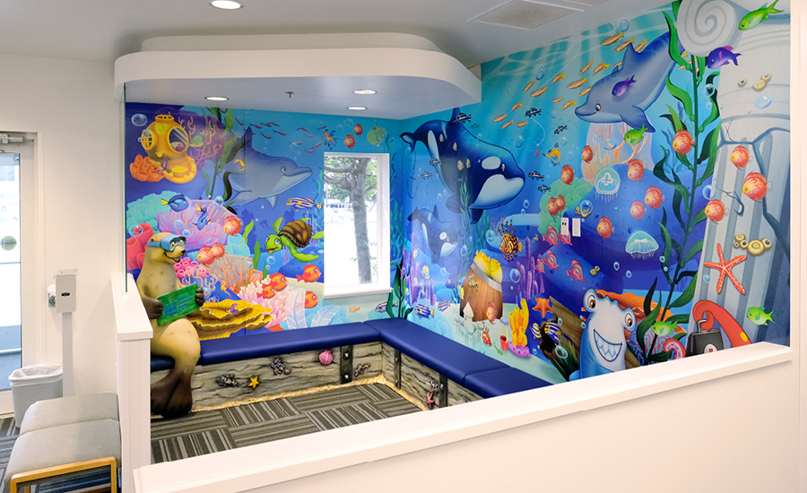 - Treatment Waiting Area – wall mural with caricatures, 2 game tablets housed in sculpted crate towers