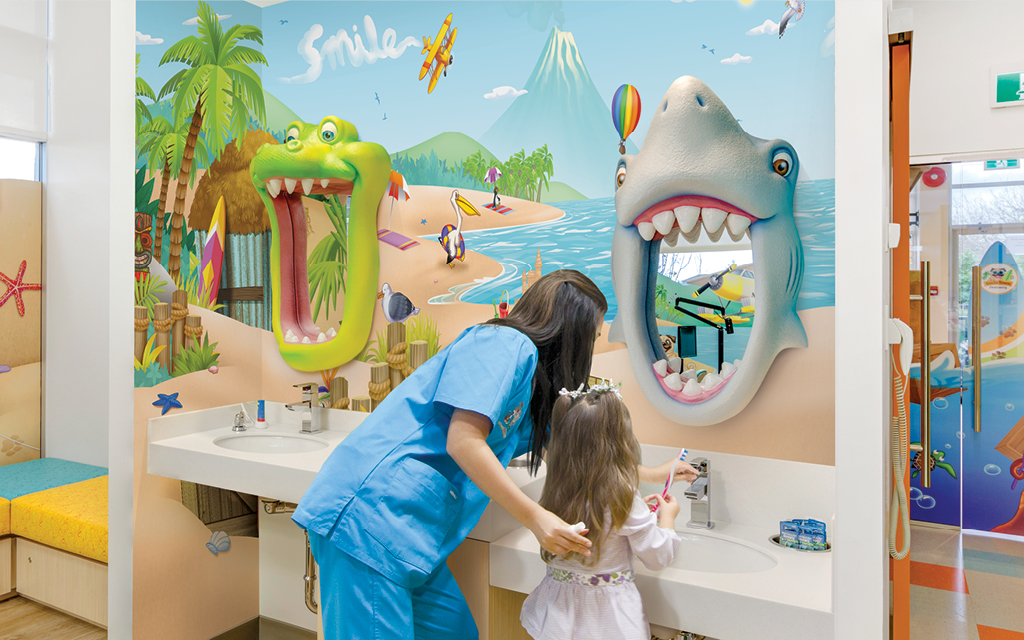 A dentist and young girl stand at a sink in a brightly lit dental clinic, showcasing a themed environment transformation with colorful murals of forest animals—bears, deer, and birds—creating a cheerful, child-friendly atmosphere.