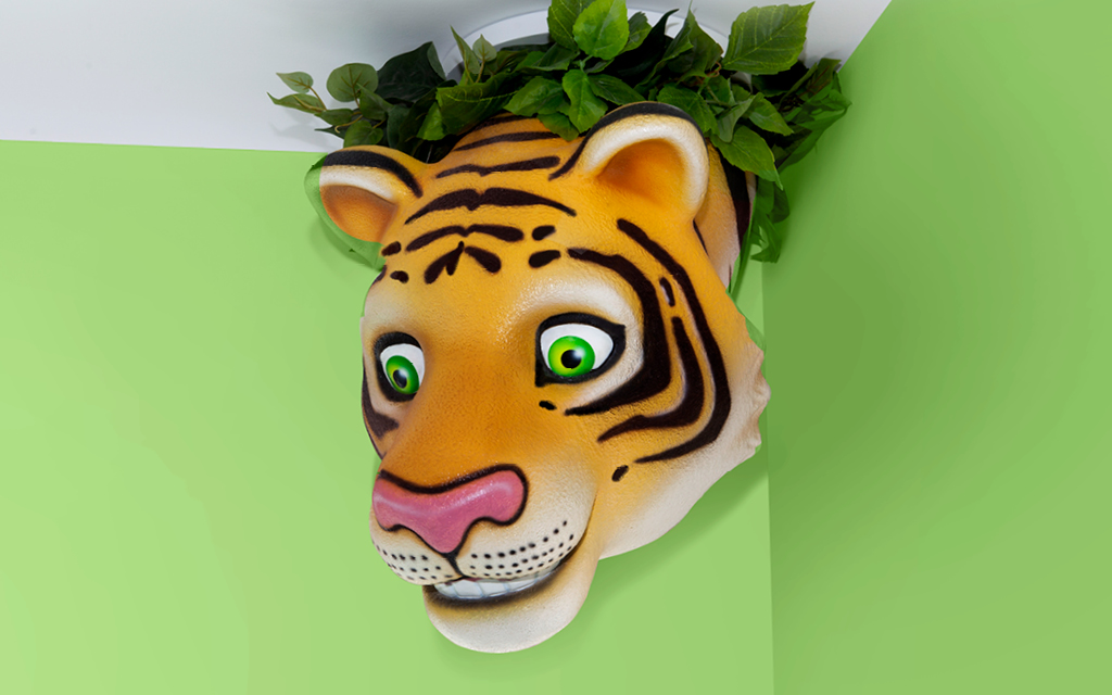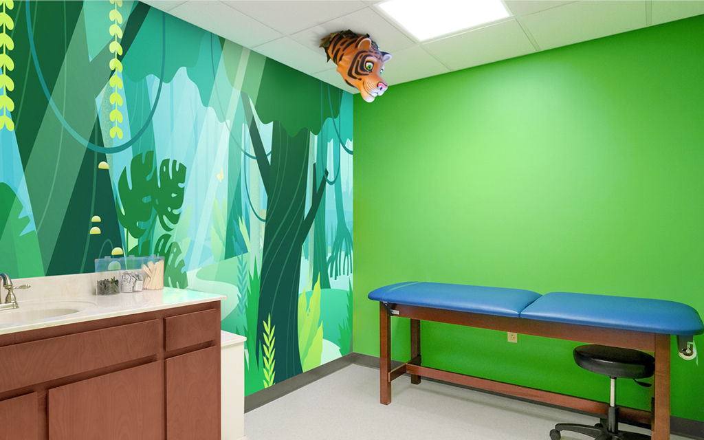 Experience a themed environment transformation in this children's medical exam room, featuring a jungle-themed wall mural, green walls, a blue exam table, wooden cabinet with sink, and a tiger head decoration hanging from the ceiling.