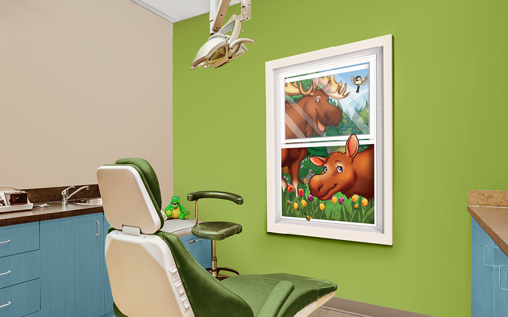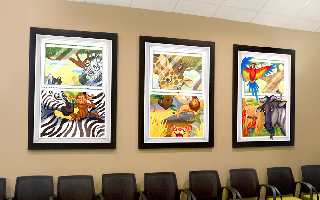 IDS Faux Windows are a simple theming solution for offices of any size. If you want a dash of color but don’t want a full wall mural, this is the answer. Your theming can appear to be outside your building looking in, making your room appear bigger, brighter, and more fun for your patients.