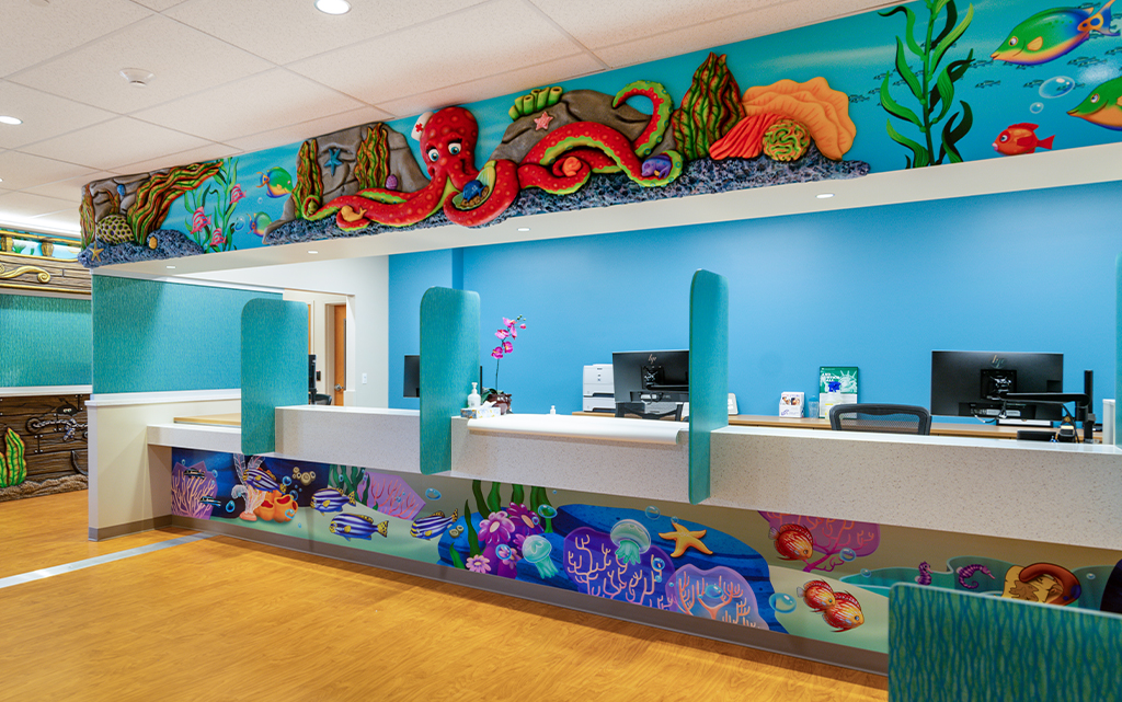 Creating a themed focal point inside exam rooms—like a jungle canopy above the chair or a friendly underwater creature by the sink—distracts and calms young patients. These small touches in pediatric treatment rooms help improve cooperation and reduce fear.