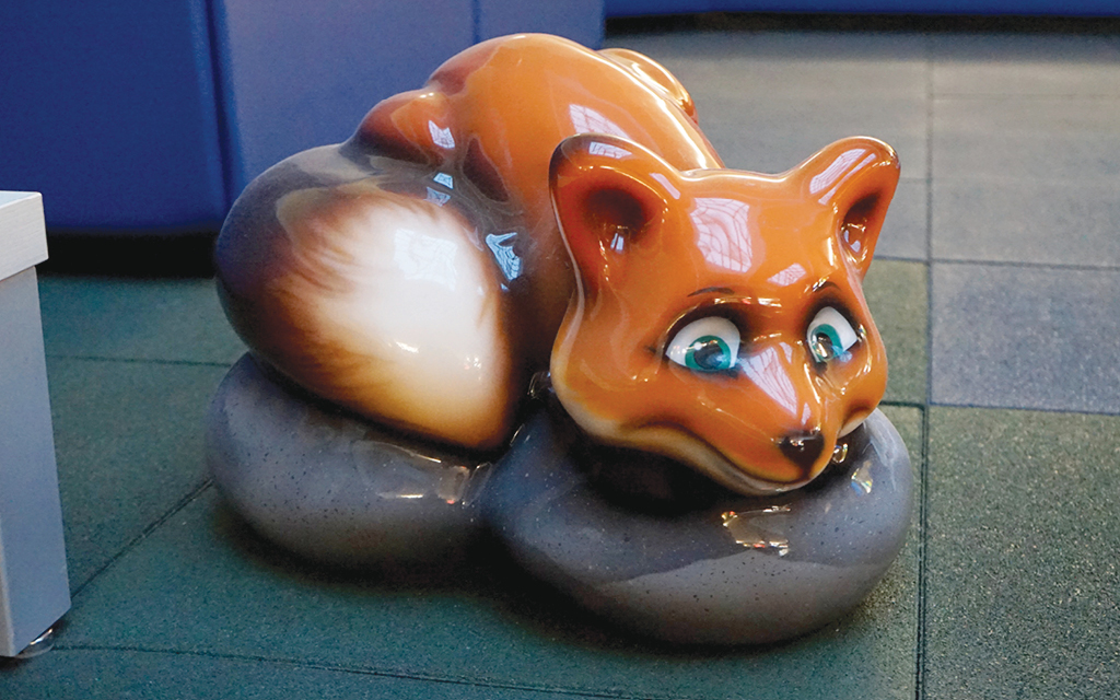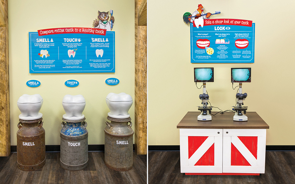 A hands-on interactive station allows children to explore teeth by feeling squishy cavities and experiencing the scents of stinky cavities. A colossal mouth model or typodont is available for children to discover the proper techniques for brushing and flossing their teeth.