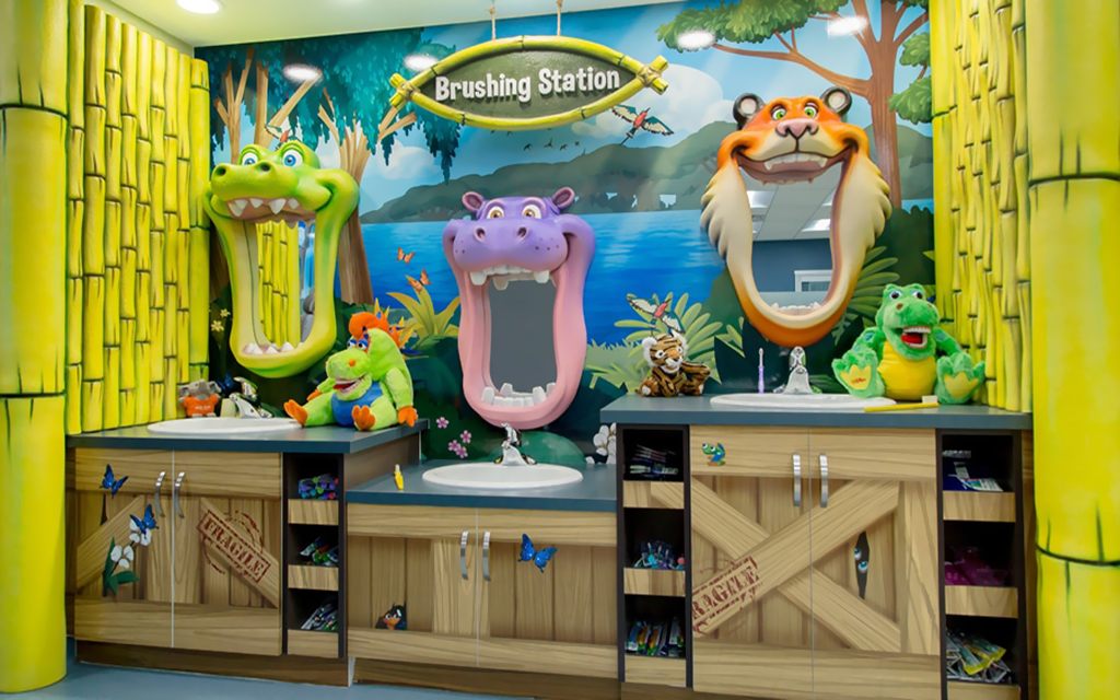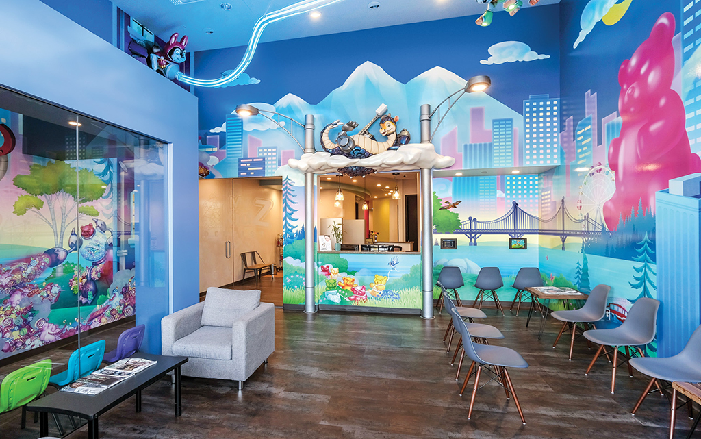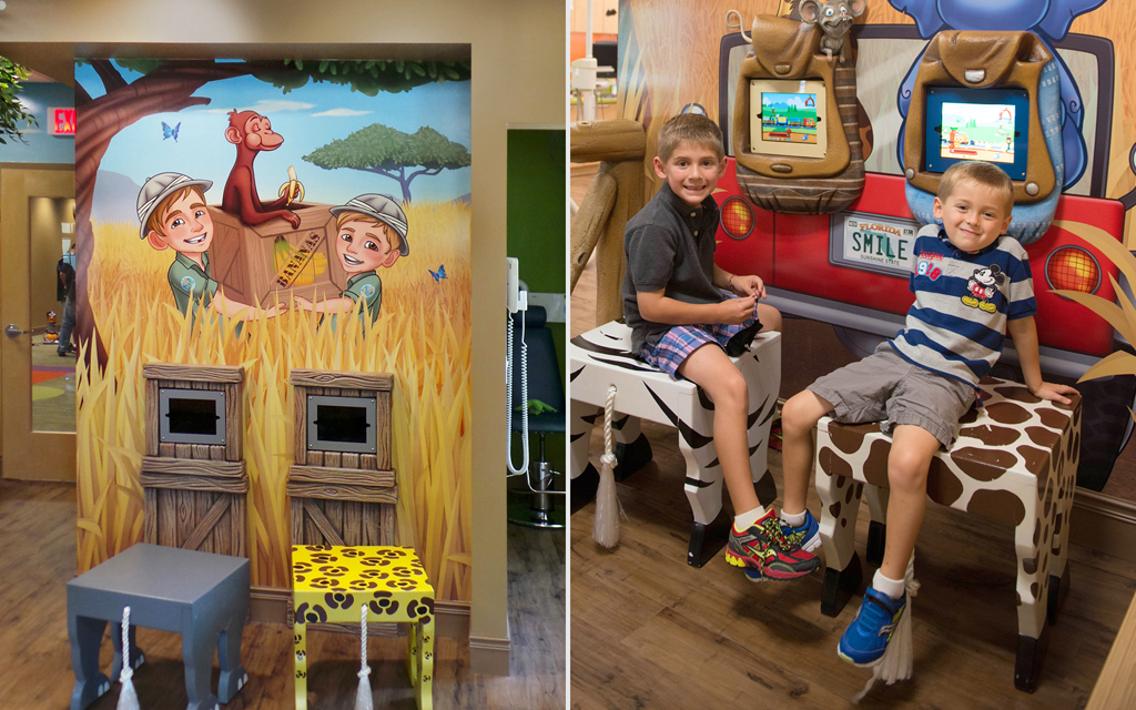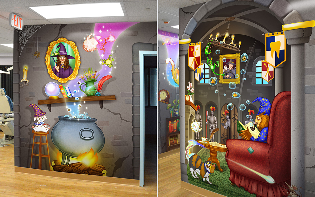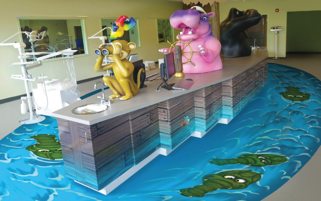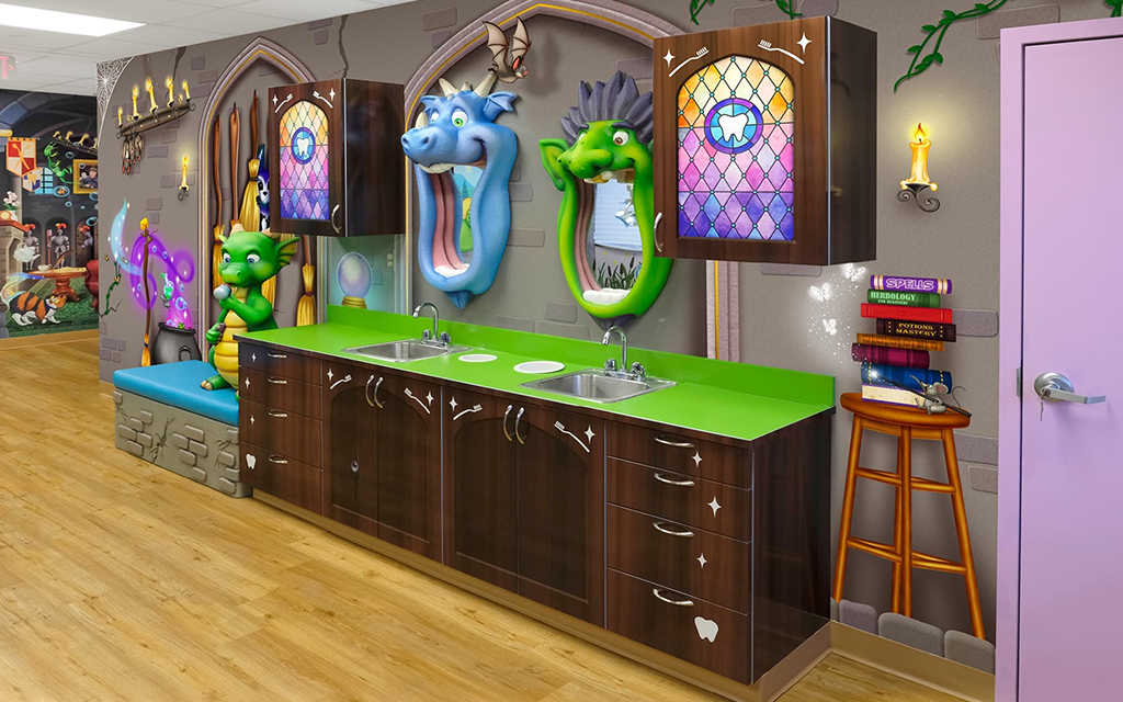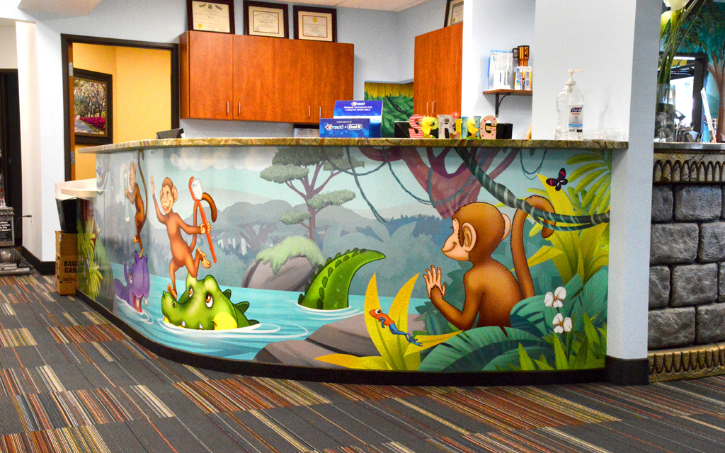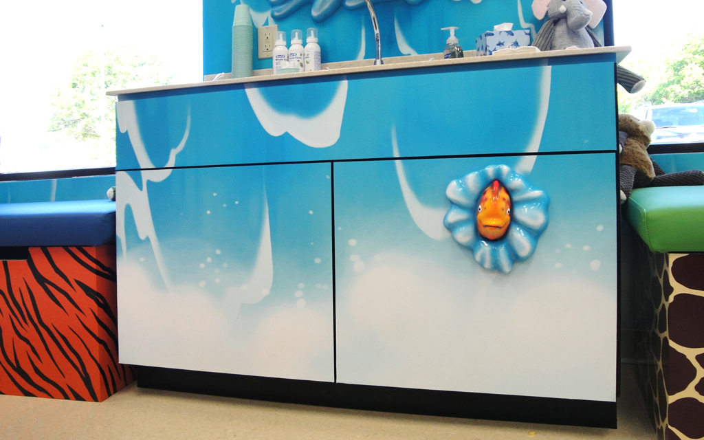 A great option for front desks is a colorful mural to welcome our young patients. You can also add a playful mural to treatment benches and office storage by simply extending your theme to cover furniture as well. These murals help the whole office come together.