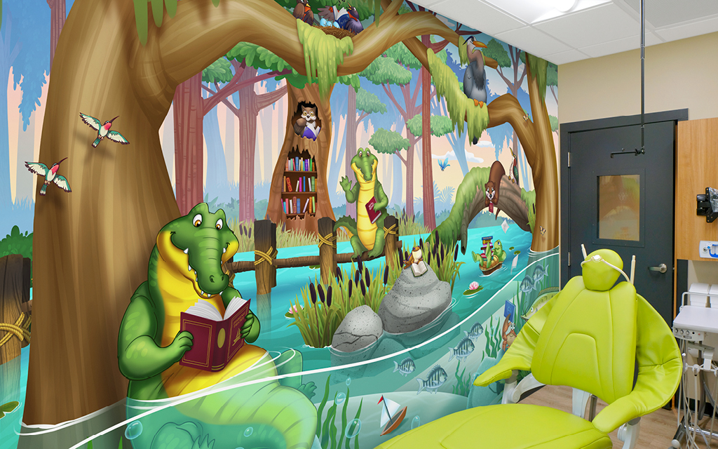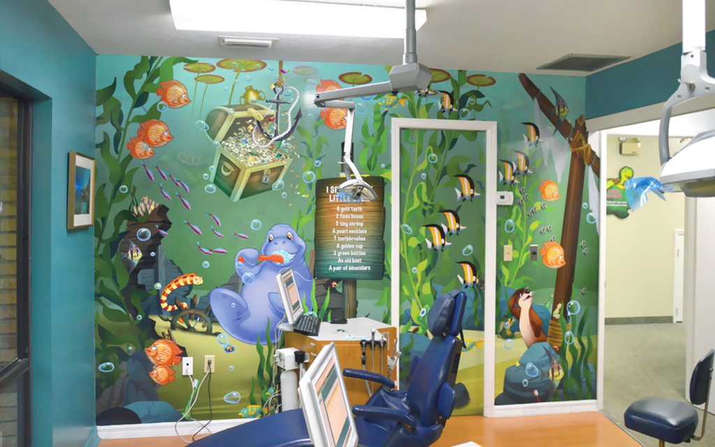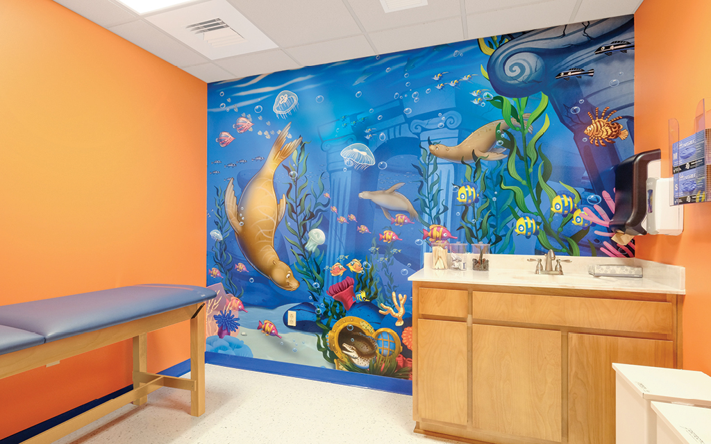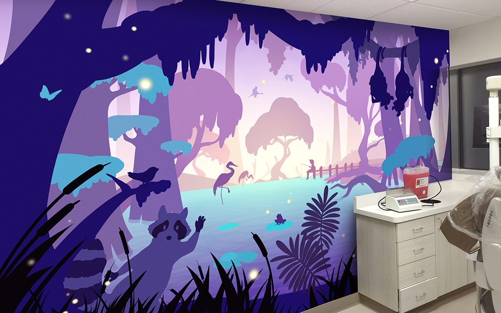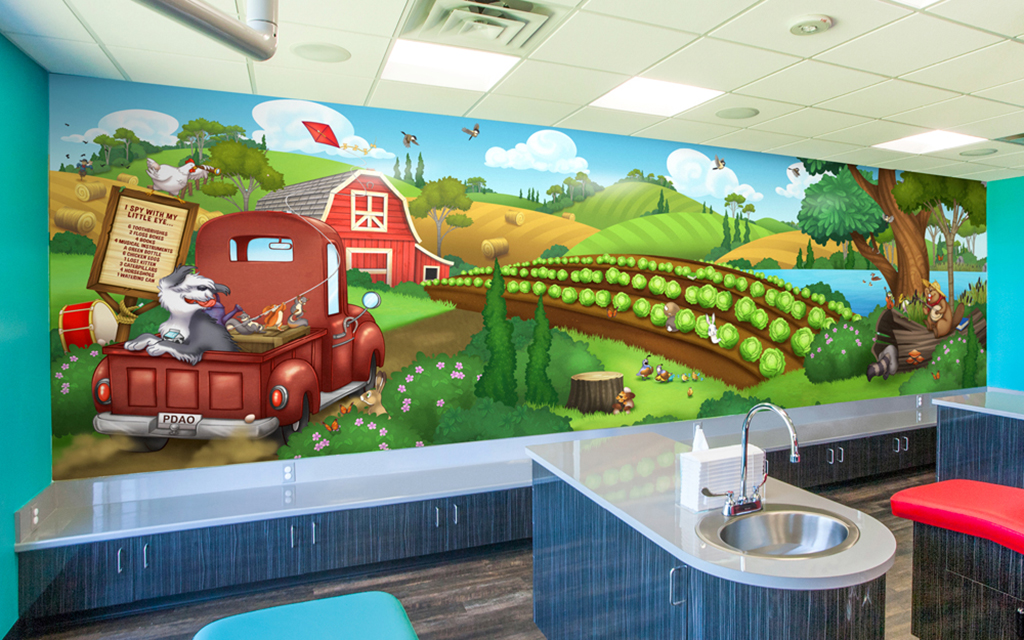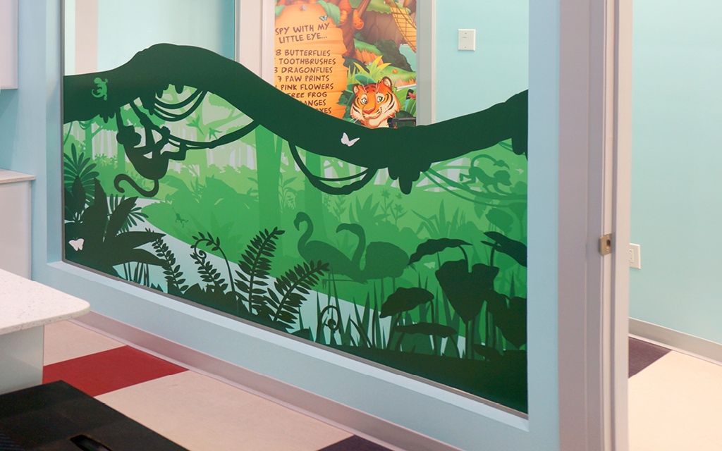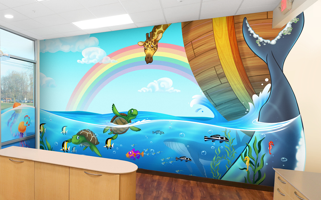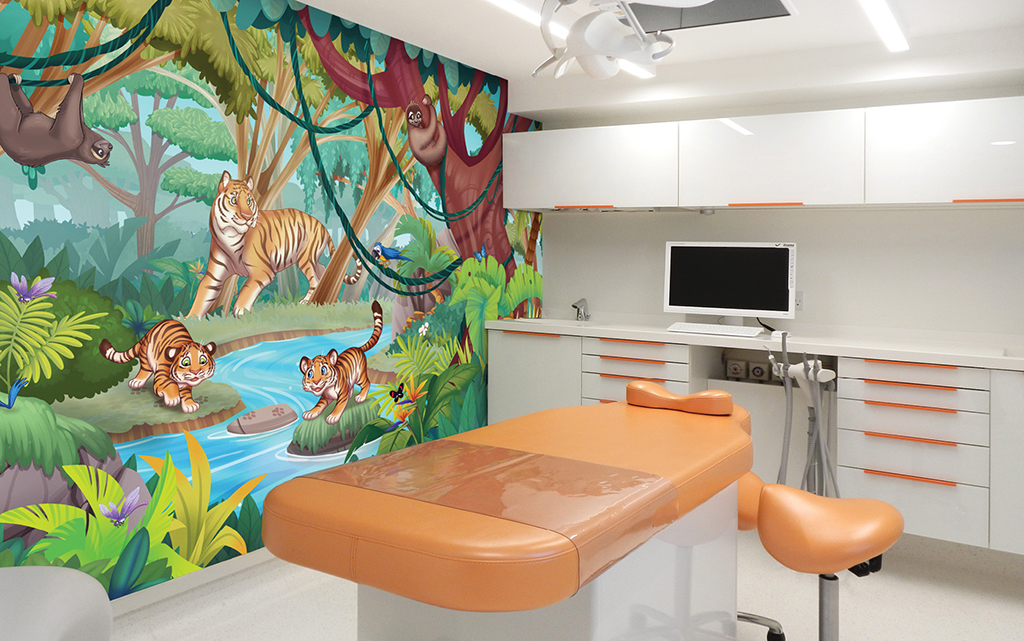 A wall mural is the perfect way to liven up any space and make it more family-friendly. Murals cover plain treatment and exam room walls and transform a room that may cause anxiety into a fun and immersive environment.