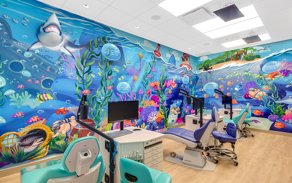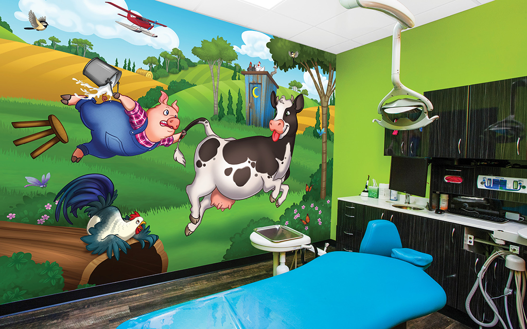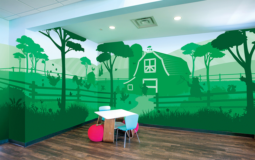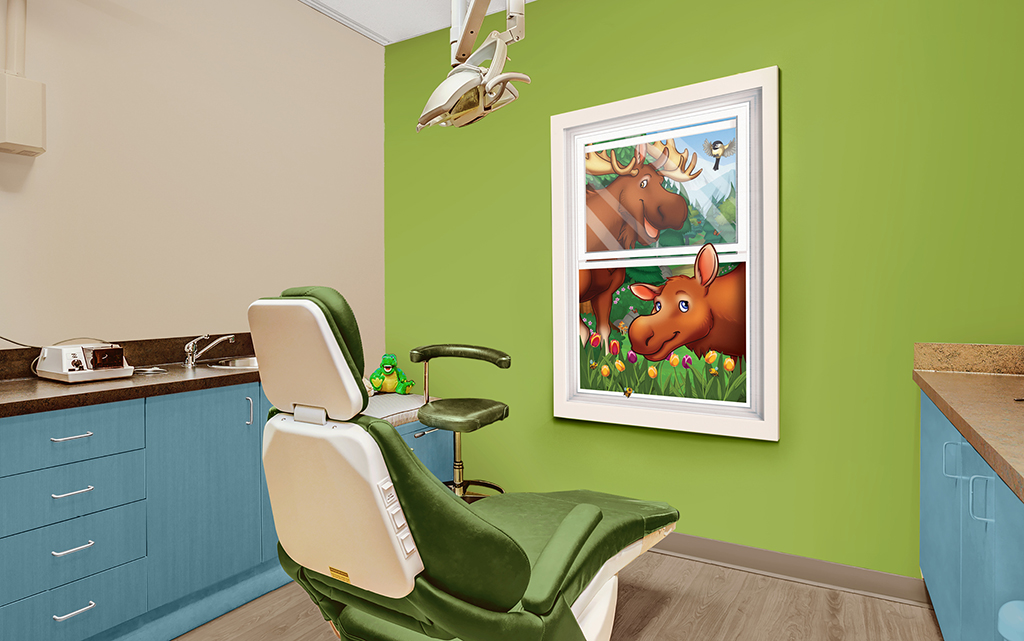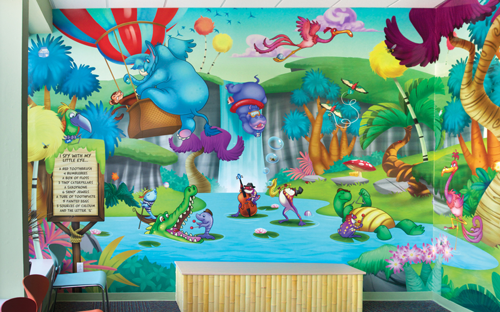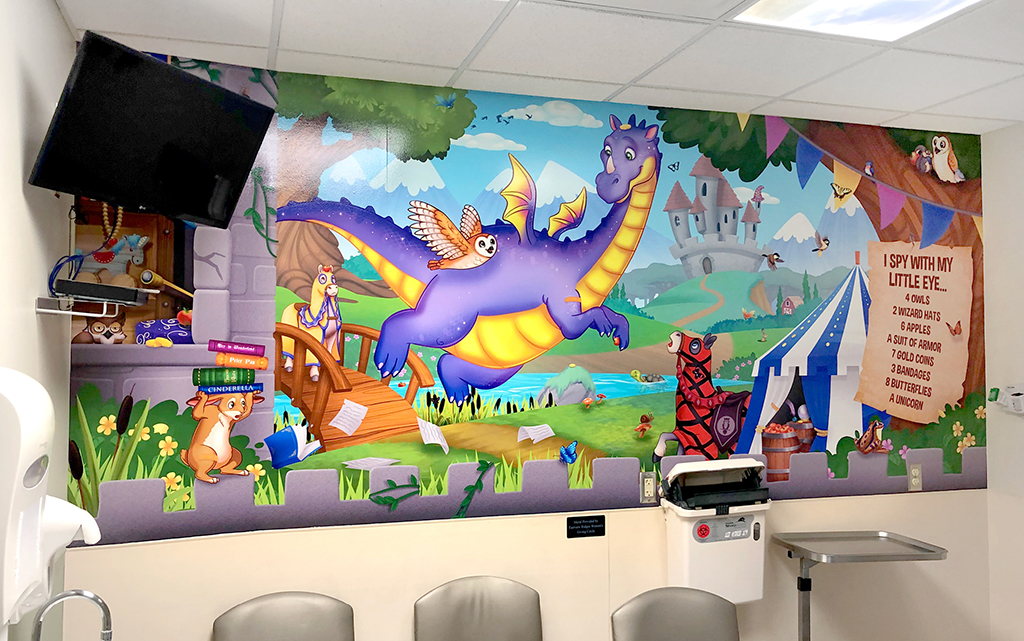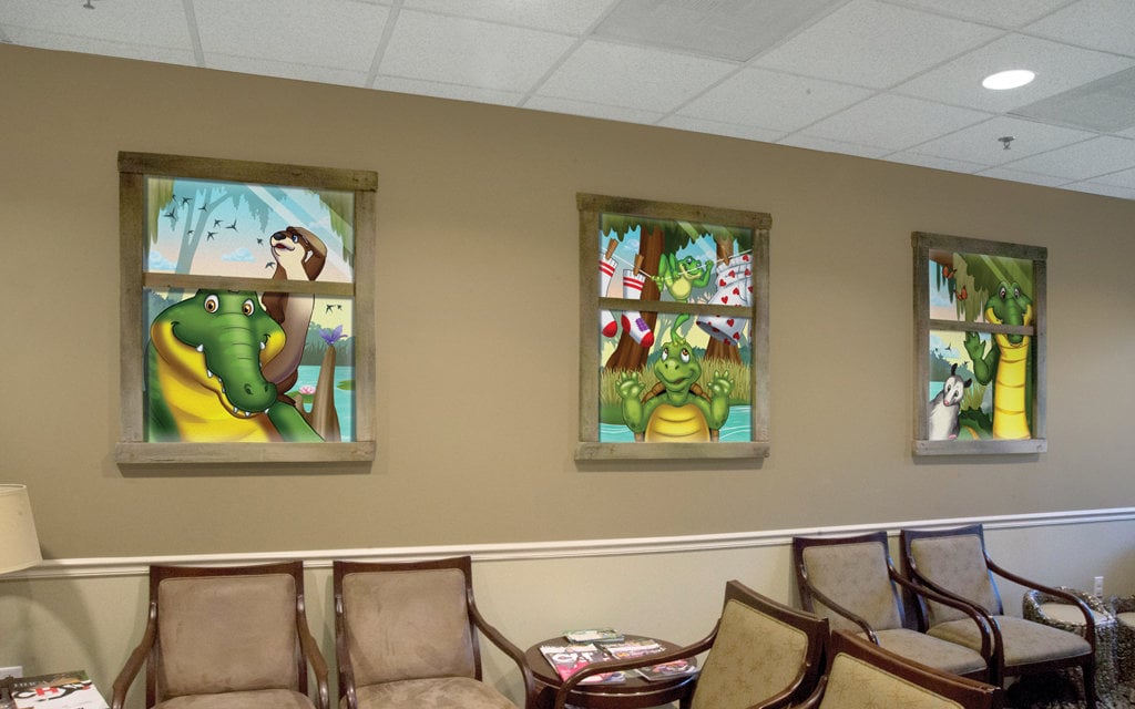 A wall mural is the perfect way to liven up any space and make it more family-friendly. Murals cover plain treatment and exam room walls and transform a room that may cause anxiety into a fun and immersive environment.