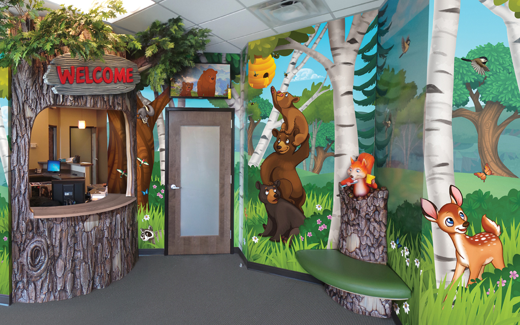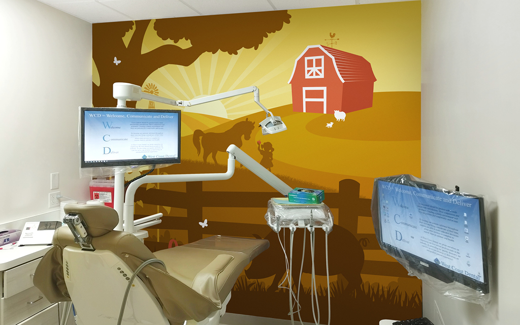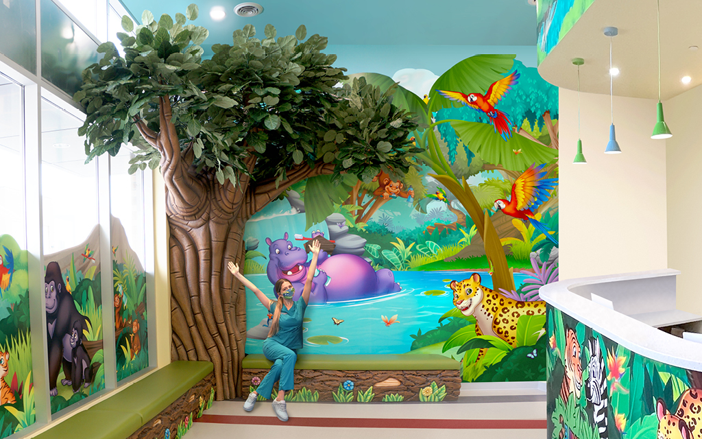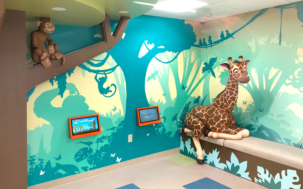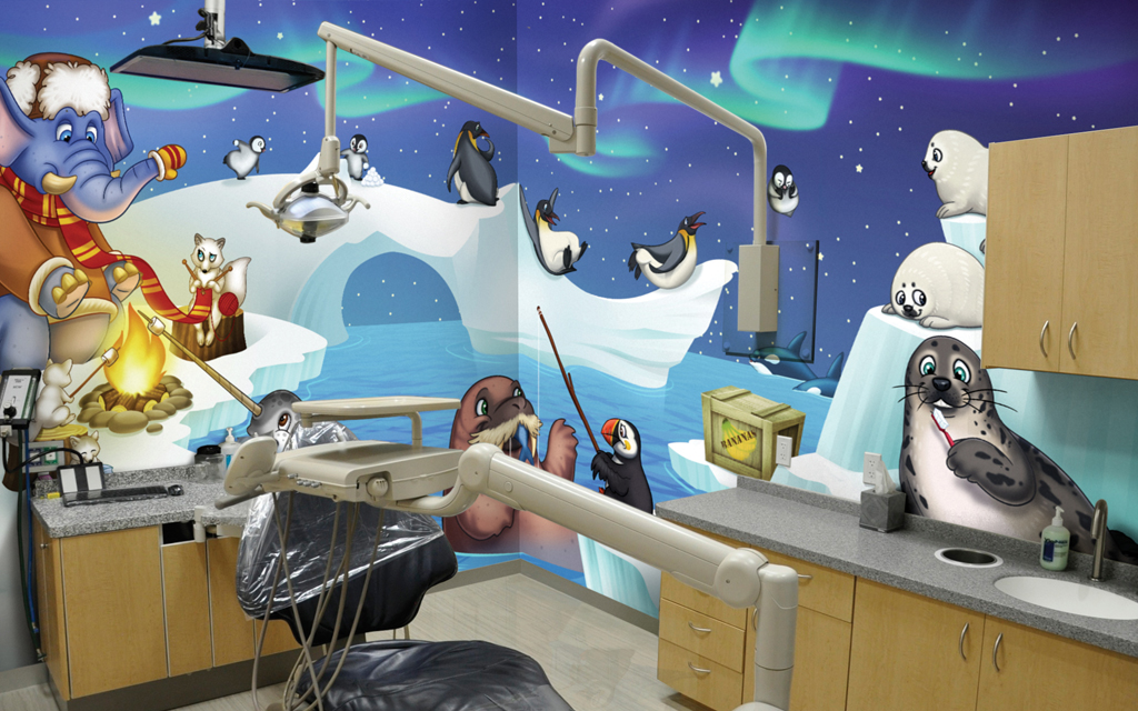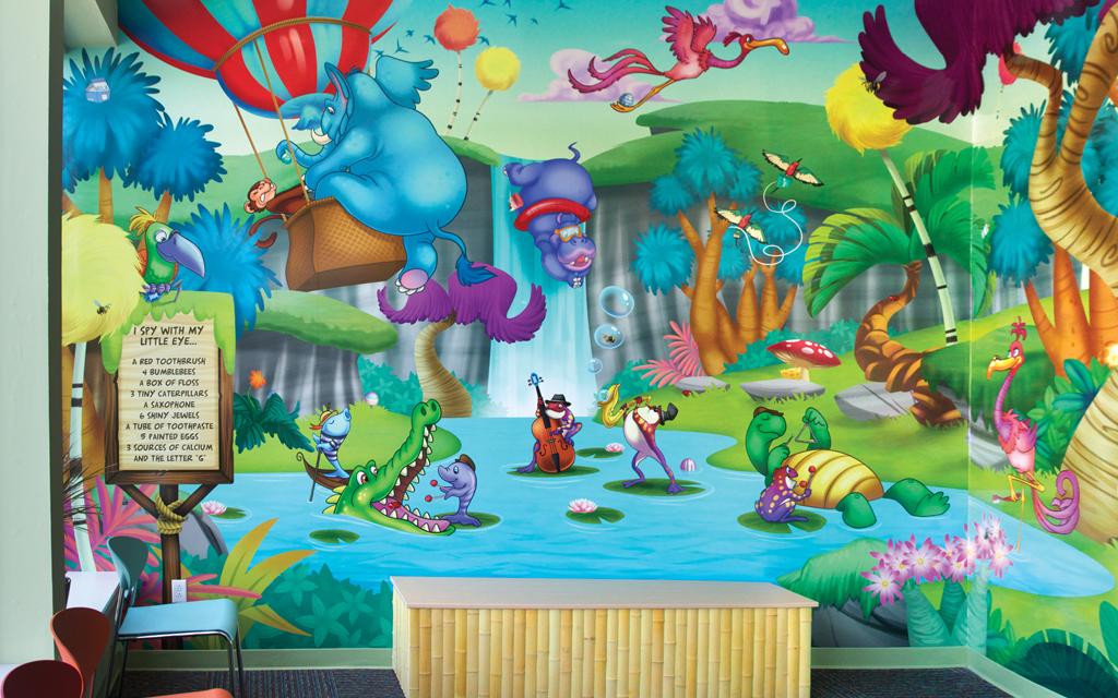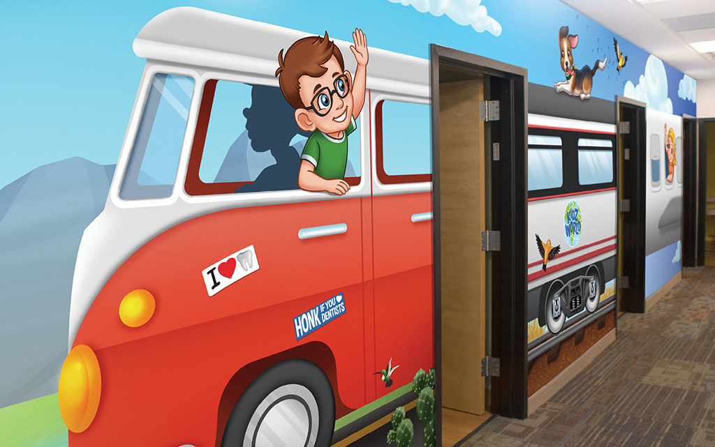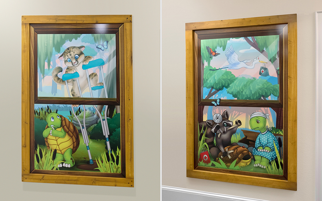 A wall mural is the perfect way to liven up any space and make it more family-friendly. Murals cover plain treatment and exam room walls and transform a room that may cause anxiety into a fun and immersive environment.