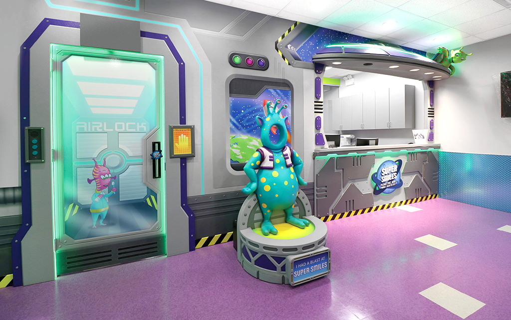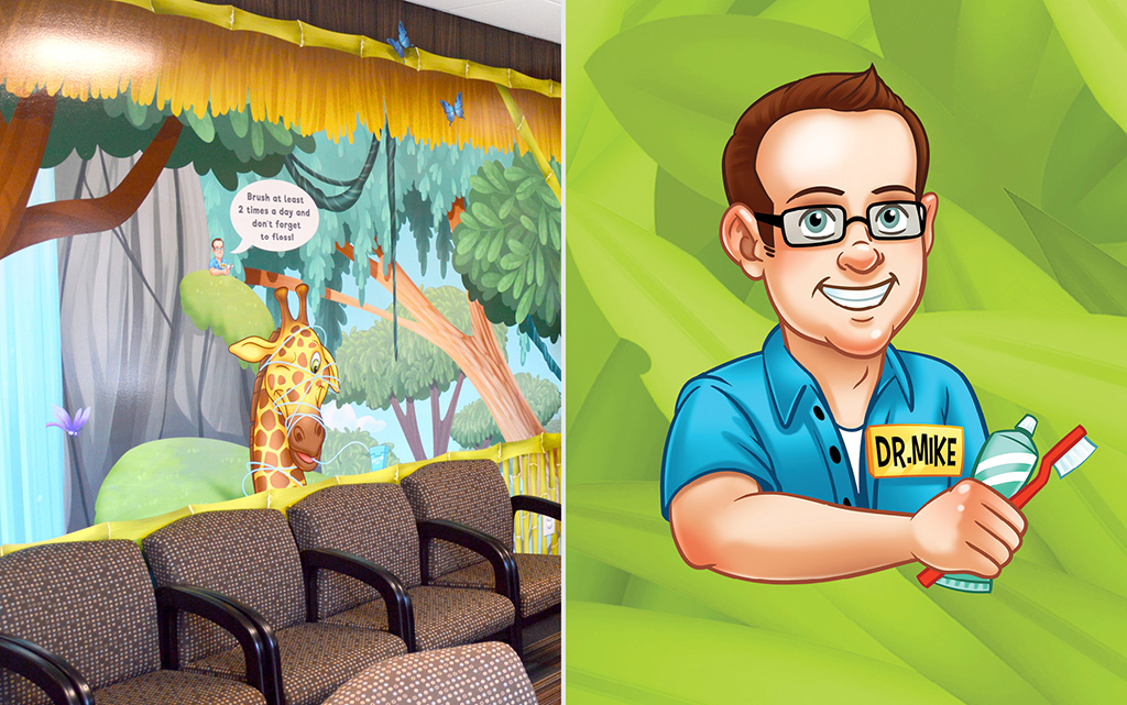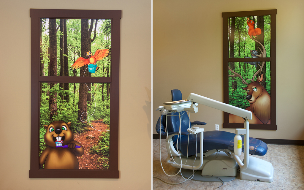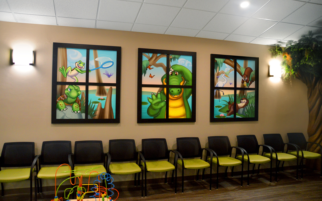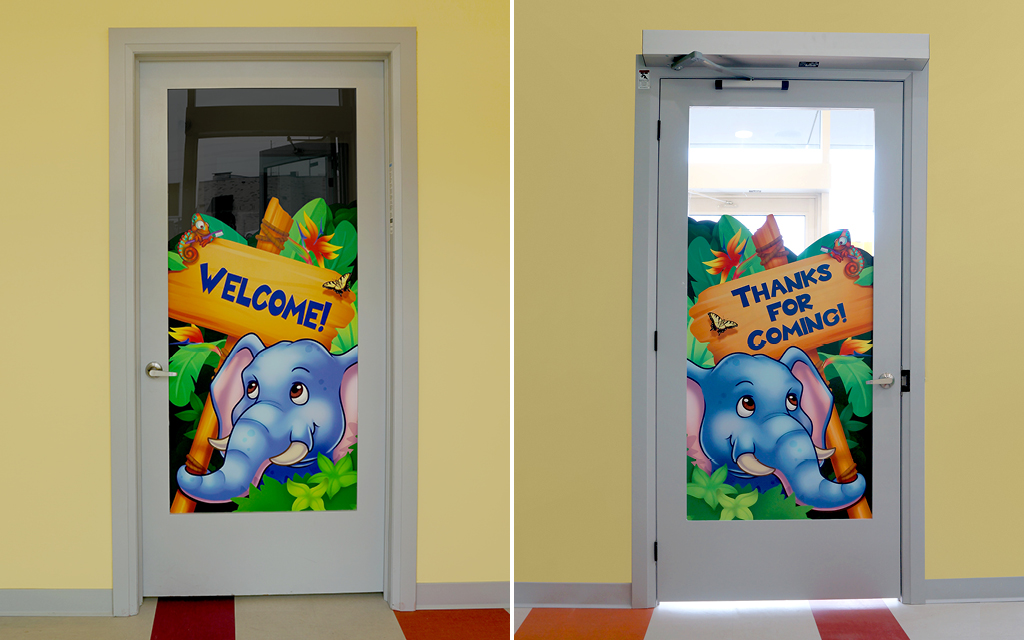 Murals can go on more than just walls. Fun graphics can be overlaid onto windows and glass, metal, or flat doors. They are a great way to keep your theme flowing throughout your office. You can even have window decals on the outside of your building, hinting at the families passing by just what kind of fun and welcoming environment you have within.