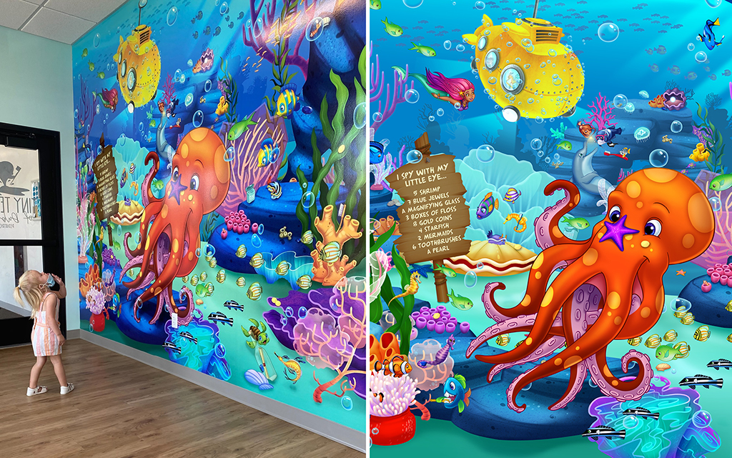 Add a game of “I Spy With My Little Eye” to any mural. Throughout the mural, our artists will hide various items for children to find. A sign with a list of objects invites children to try and “spy” each item. This hands-free game has grown in popularity in recent years. We are excited by the possibilities of themed gaming that prioritizes safety and hygiene without compromising the aesthetic appeal of a space.