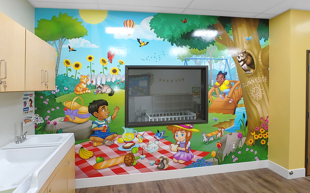 Our custom murals are designed around your existing office features. You’ll never have to worry about a light switch covering a character’s face! Want to add a personal touch? Include your company logo, add mascots, or create characters that match your theme, and IDS will bring your vision to life.