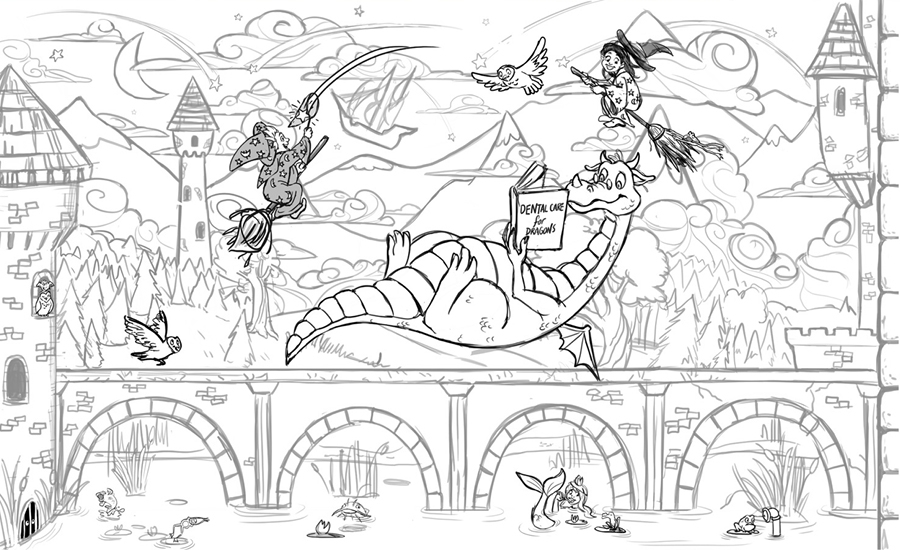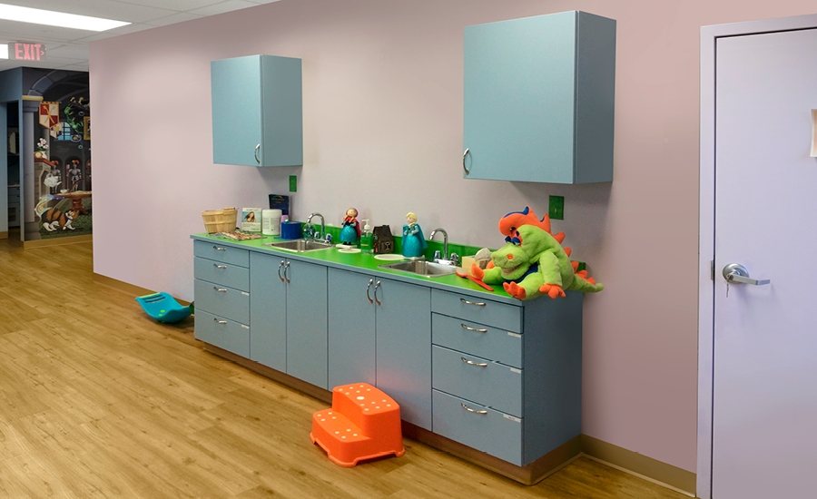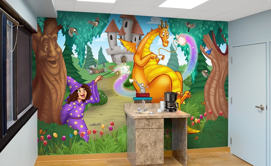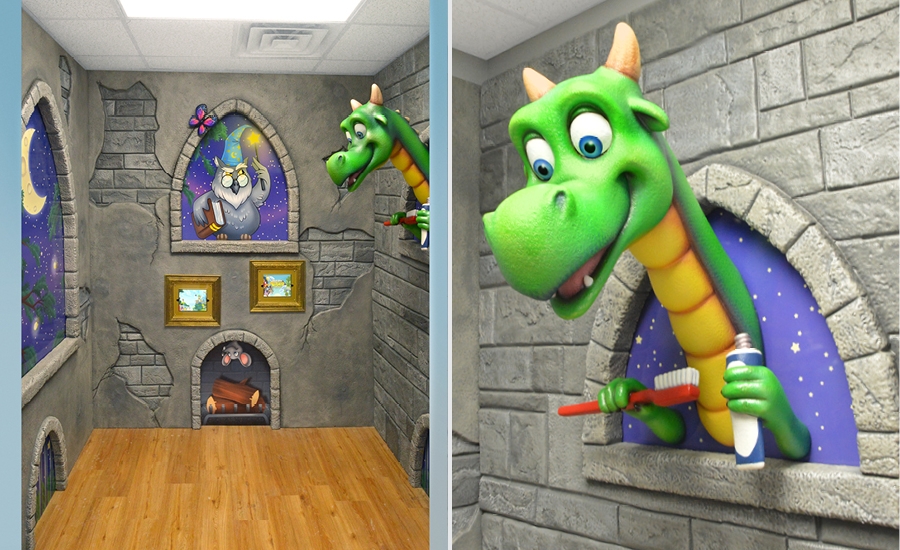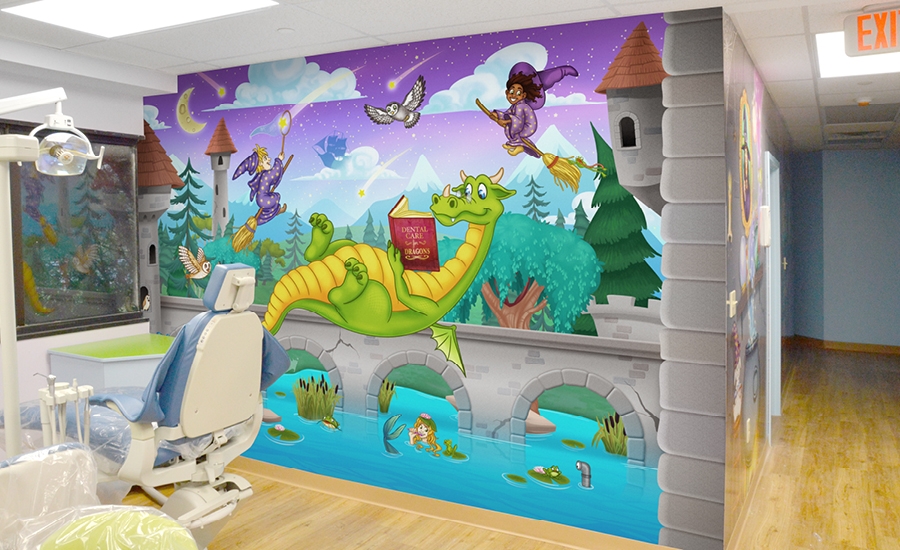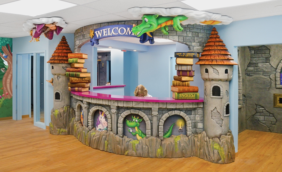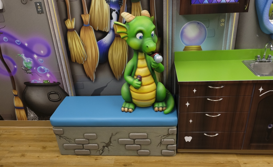 More custom murals, goblin and dragon brushing mirrors, and an adorable dragon character bench were added to the treatment area to make it fun and inviting for kids.
