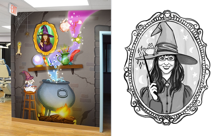 Amazing custom murals cover the reception desk, a private playroom, the treatment room, hallways and the refreshment area in the waiting room. Portraits of the dentists dressed as witches and wizards make these murals even more special.