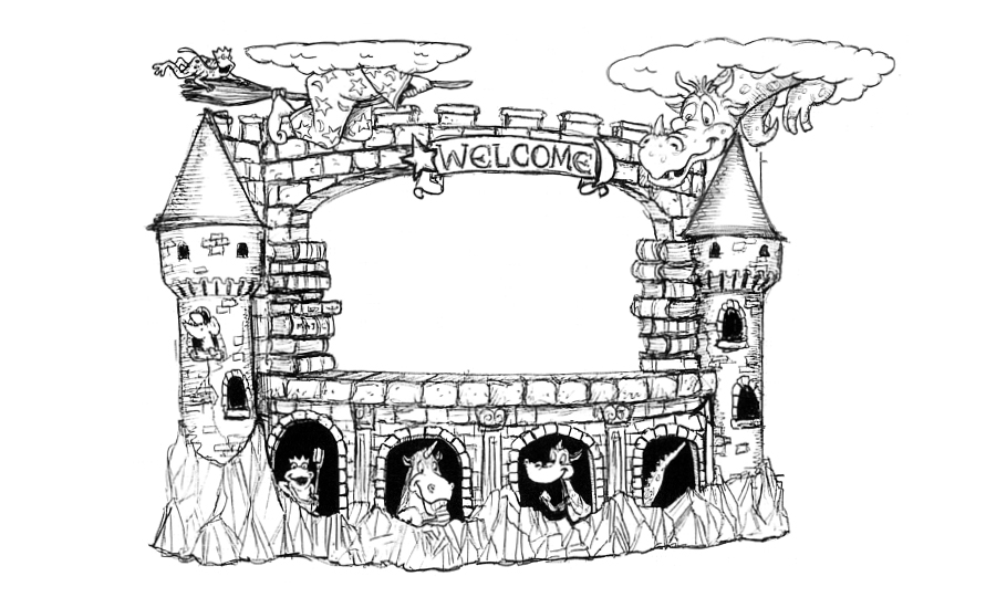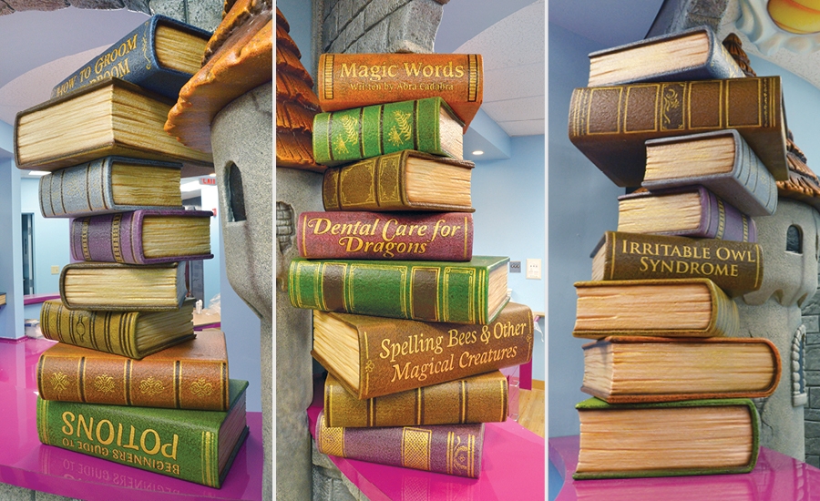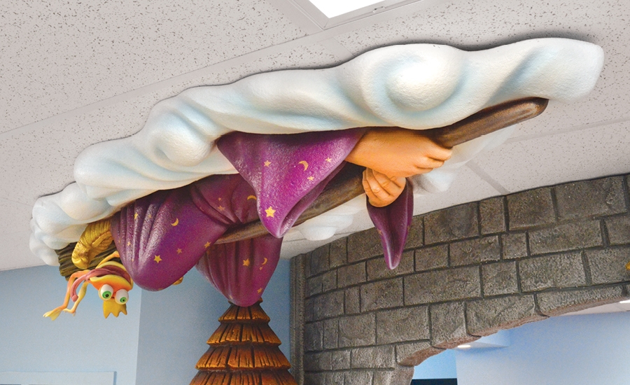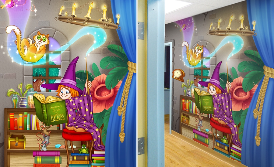 Step into a magical world with surprises around every corner. The reception desk, designed to look like a rocky castle, starts the show. The desk is flanked by a flying wizard and dragon – a cool twist on ceiling decor. As always the small touches make the 3D elements so much fun, like the frog prince who isn’t enjoying the ride on the end of the wizard’s broom.