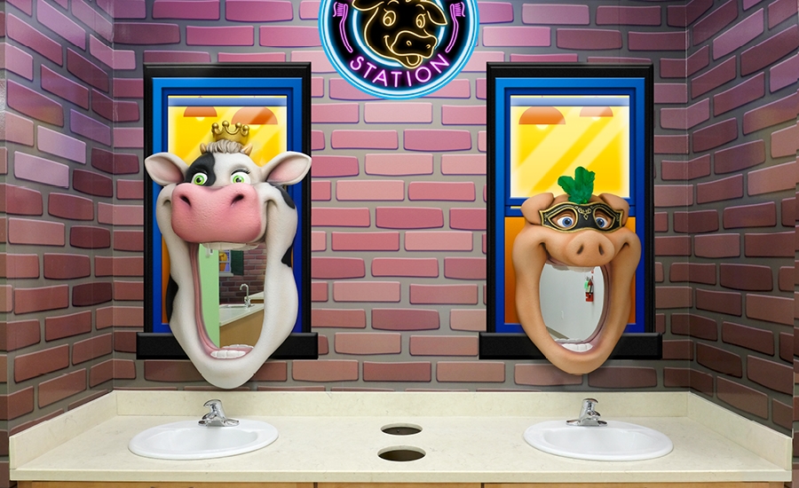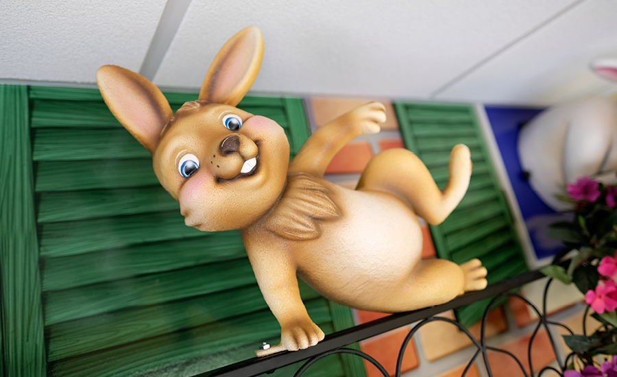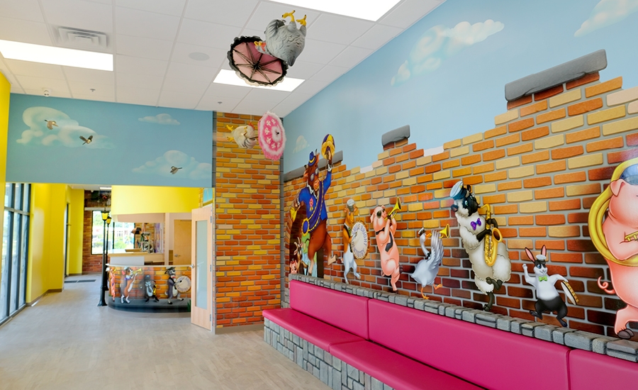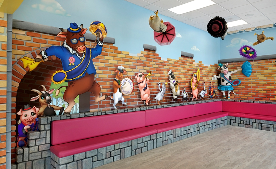 Continuing into the waiting room, visitors can seat themselves on the comfy sculpted faux-stone benches that complement the murals lining the walls from floor to ceiling, fully immersing kids and parents alike. Looking up, kids can catch a flock of humorous hens that are being swept away by the wind with their colorfully decorated parasols! Another cow character joins in on the fun as a charming distraction for anxious children.
