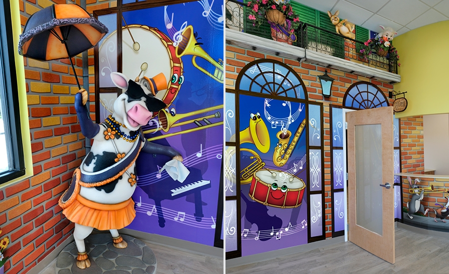 Inside the front door, the reception desk features a custom mural of cute animals playing jazz instruments marching in a second line parade. Next to the desk is a stylish cow photo-op dressed for the celebrations and dancing along. The mural kicks off with the animals in the line beginning their journey around the practice. Our designers also added a faux wood sign as a neat finishing touch.