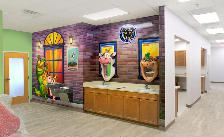A fully themed brushing station keeps the magic going into the open bays, where some Mardi Gras smile tiles and murals keep patients happy during their treatment.