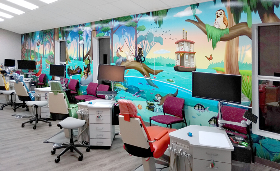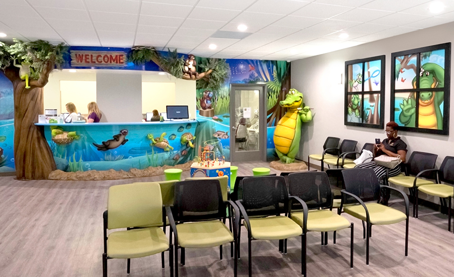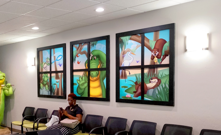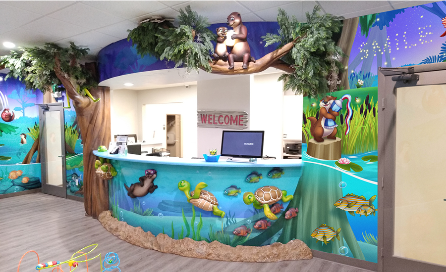 For this pediatric office’s second theming phase, the doctor wanted to elevate his existing decor with the addition of more murals and a few waiting room touches. Calming sunset scenes of the nearby everglades were added, while some of the existing sculptures and 3D elements were rearranged to help give the clinic a completely new look.
