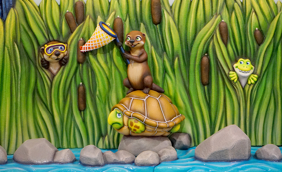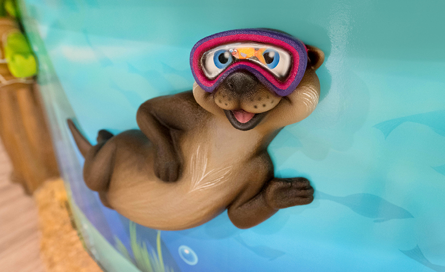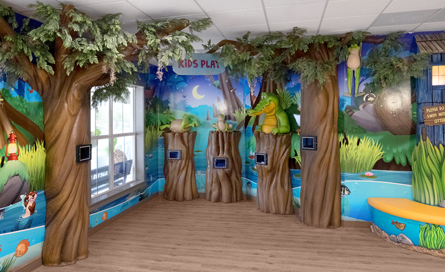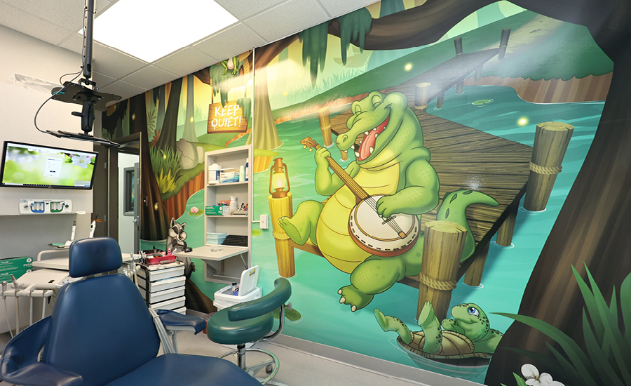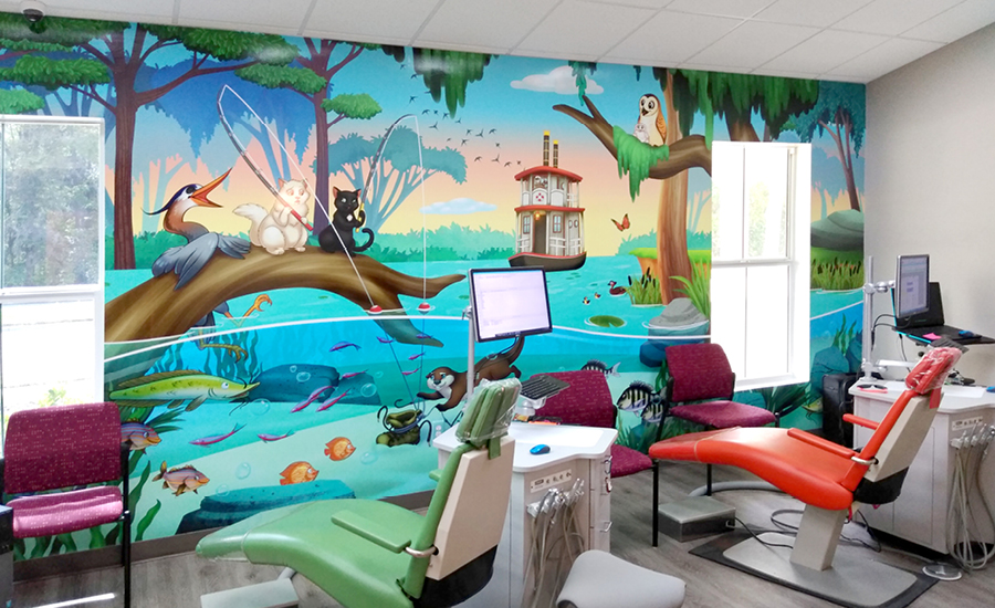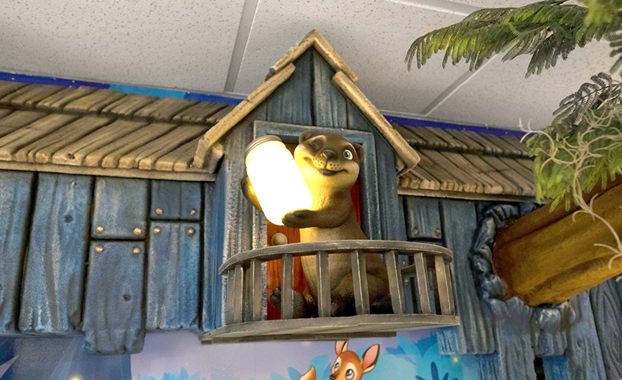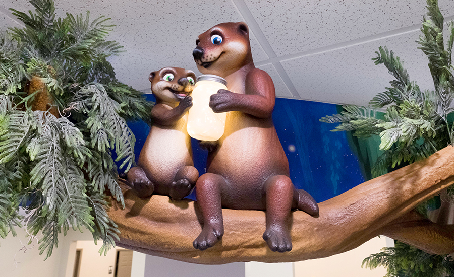 Visitors are immediately welcomed by a host of fun characters in the everglade twilight. The reception desk features an otter and its turtle friends swimming alongside a school of fish beneath the waterline. Hanging out on a branch, kids can catch a baby otter and its mama holding onto a jar of fireflies. A set of faux windows run along the wall adjacent to the front desk, adding some color without the need for a full mural.