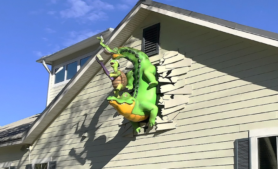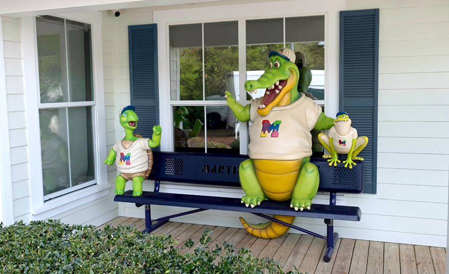 Outside, the office’s mascots can be seen busting through the front of the clinic, serving as a landmark and catching the attention of any passersby. A photo op bench with the practice’s mascots sits outside the office as a great way for patients to remember their visits.