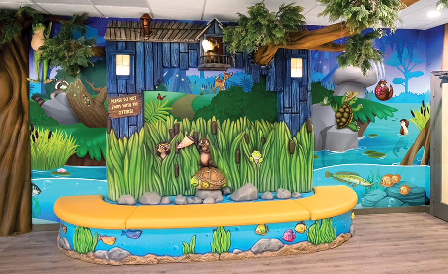 For the waiting area, an impressive half-oval bench with a sculpted underwater base, a row of cattail reliefs, and a blue treehouse makes for an eye-catching and entertaining piece of seating while patients relax before appointments.