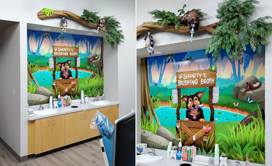 Inside the treatment bays, a themed brushing station complete with murals and a branch with more mischievous critters stands out. Here, our client was excited to incorporate a personal touch into the murals by including their own pets, while the open bay features a brilliant wall-to-wall mural for patients to explore while they receive care.
