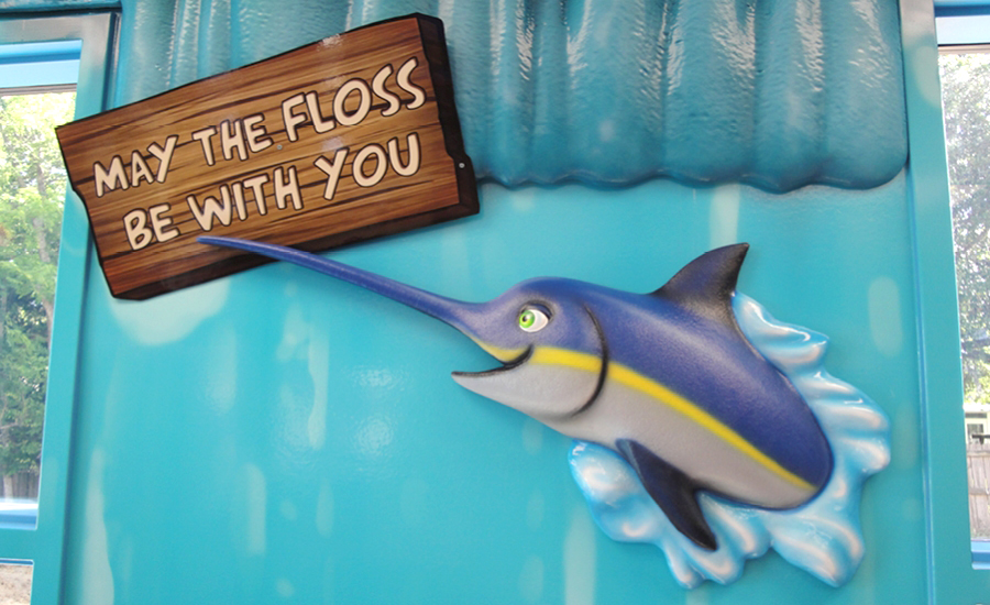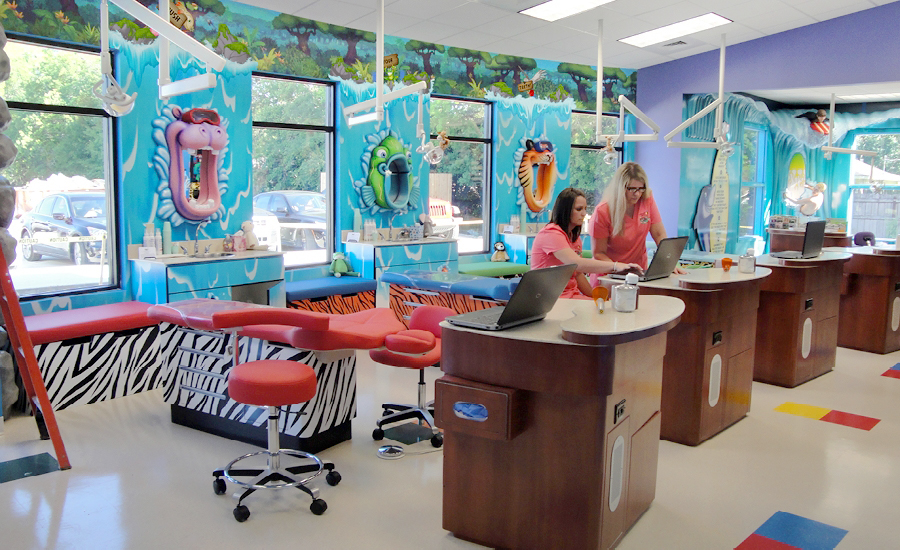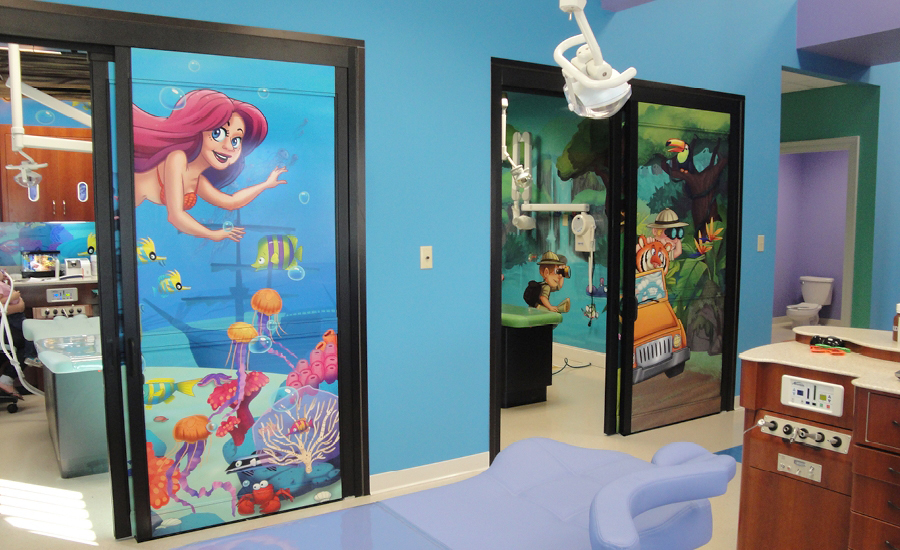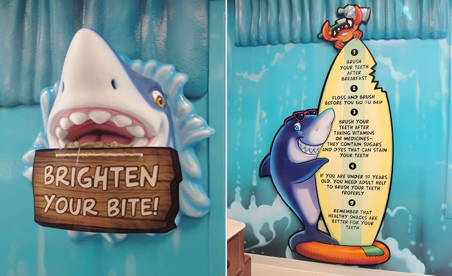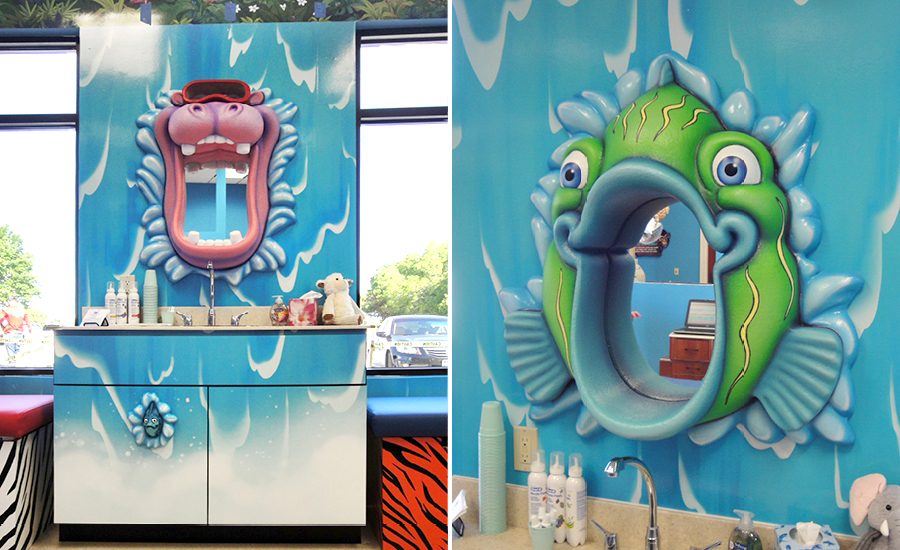 Every room in this practice features large, bright murals. In the treatment bays, large murals depicting ocean waves meet with 3D sculptural ocean curls. A treatment room for girls has an underwater mural with beautiful mermaids and a treatment room for boys looks like a jungle adventure.