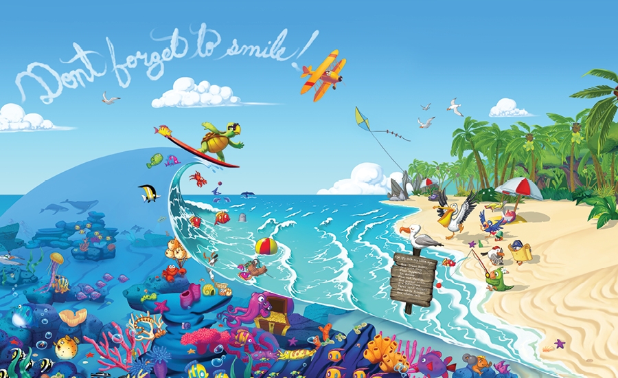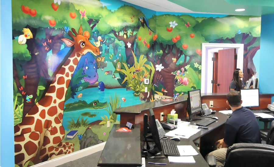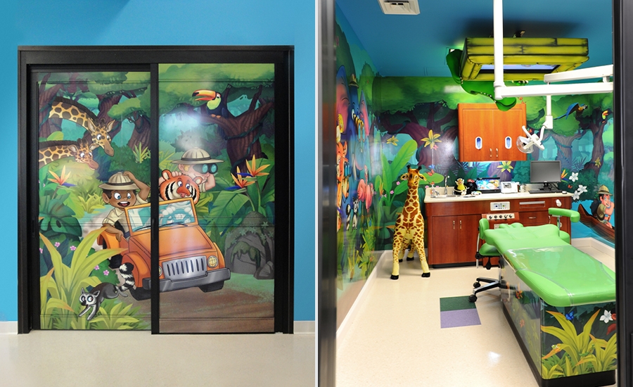 In the waiting room, a custom game of “I Spy With My Little Eye” has been integrated into the murals. Children can try to find all of the objects listed in a big picture of a jungle beach and undersea world. Contact us to start theming your office today!