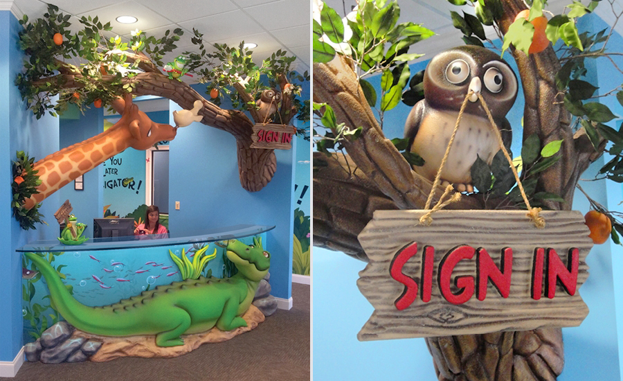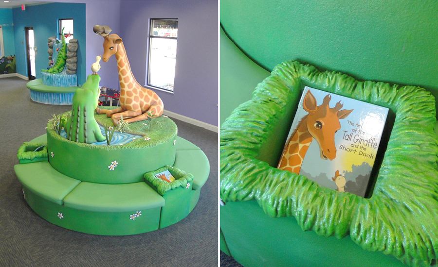 The theming in this office is based on a storybook that was created by the dentist. IDS recreated her characters, bringing pages of the storybook to life using colorful murals and 3D sculpture. What story would you like to tell? Imagination Design Studios can take your ideas for a theme and build the office of your dreams!