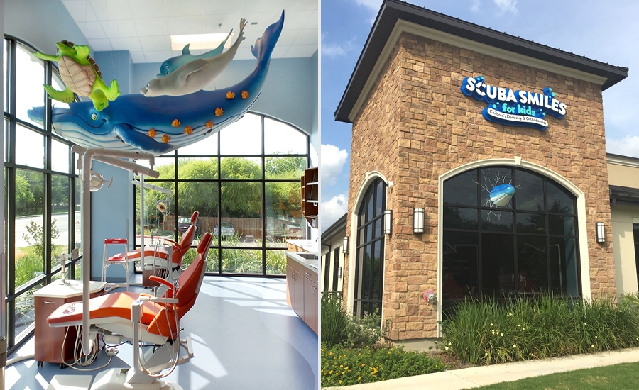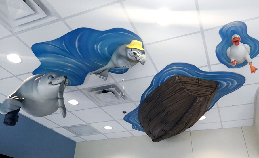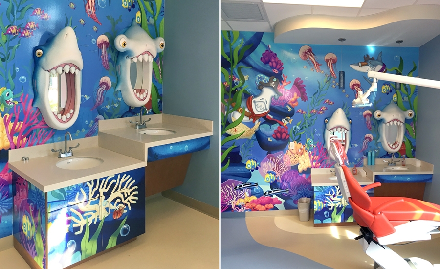 This underwater themed dental office is sure to make a splash. A massive whale swims through the open bay and out through the front windows! The whale’s nose is visible on the office exterior, bursting through the glass below the office sign.