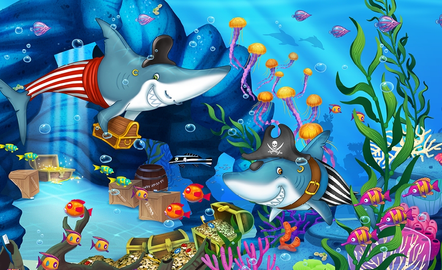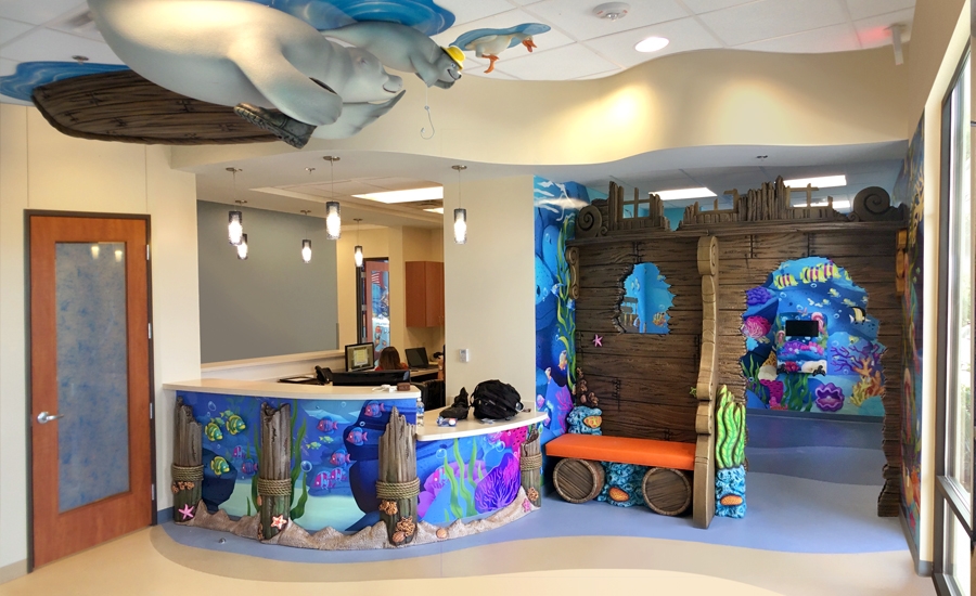 In the reception area a sunken ship provides a place for kids to play and includes handheld and console gaming systems. Throughout the office underwater critters swim with various items of fisherman’s equipment, giving it out to their fishy friends.