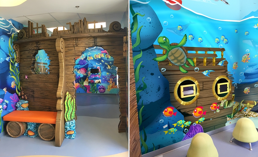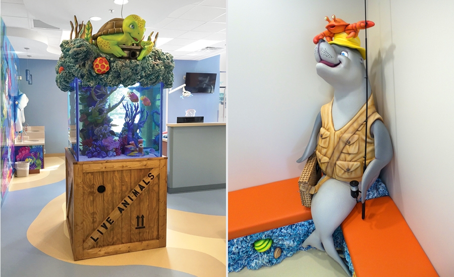 Patients can pose at a photo-op that has a seal with a crab on his head. The camera is held by a turtle on top of a nearby fish-tank filled with live fish, making kids feel like they are a part of the underwater adventure when he takes their picture!