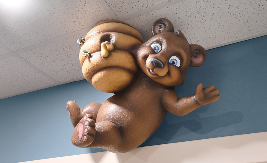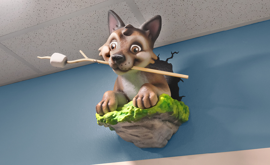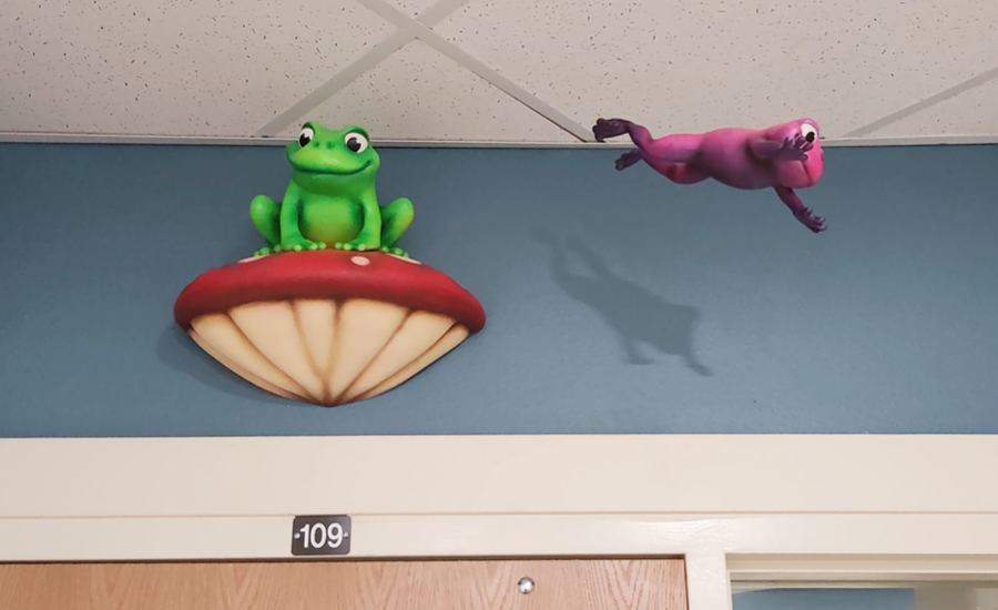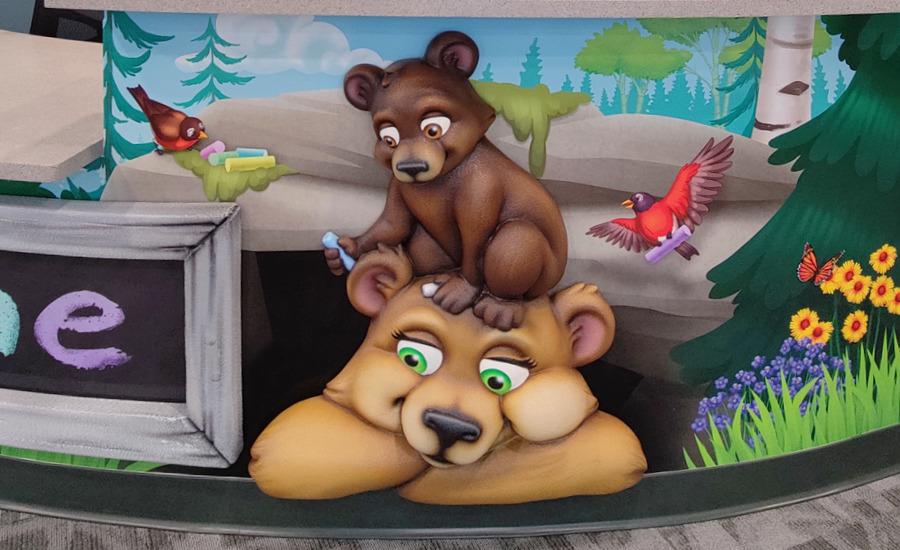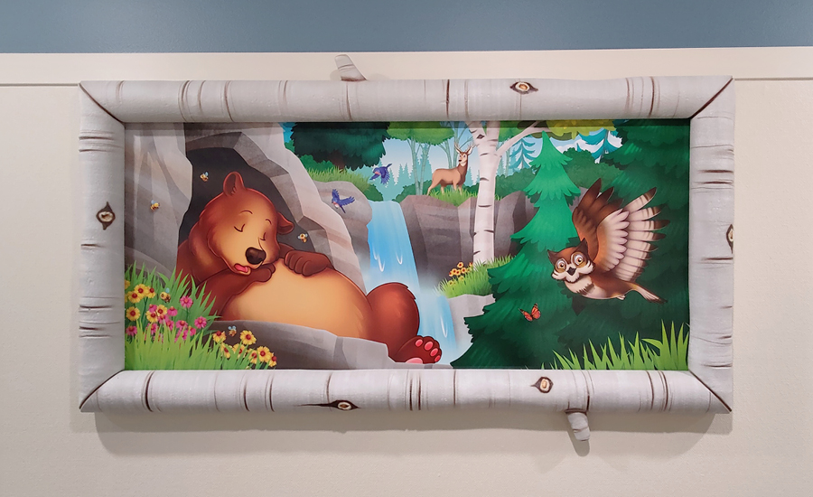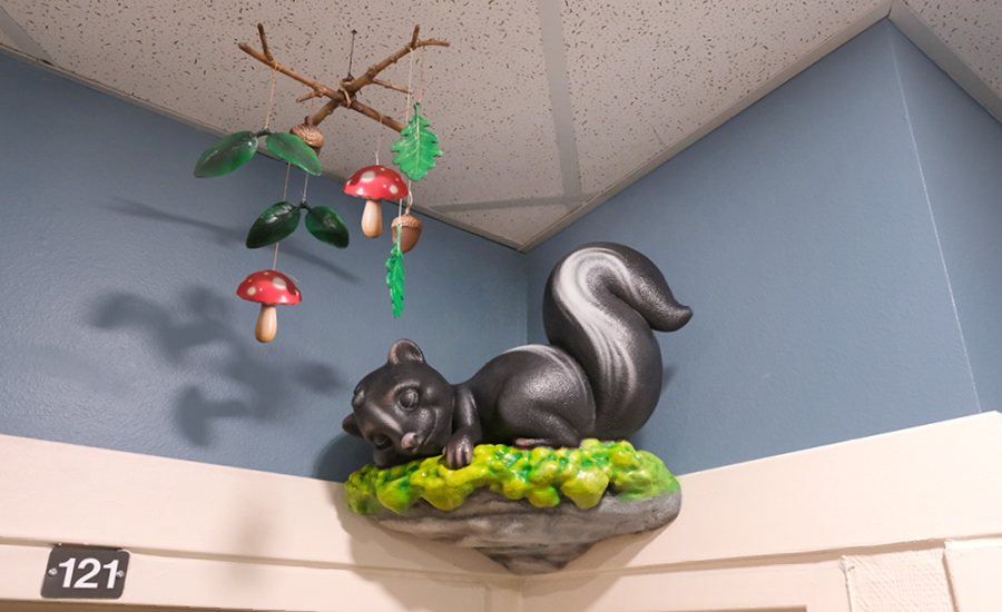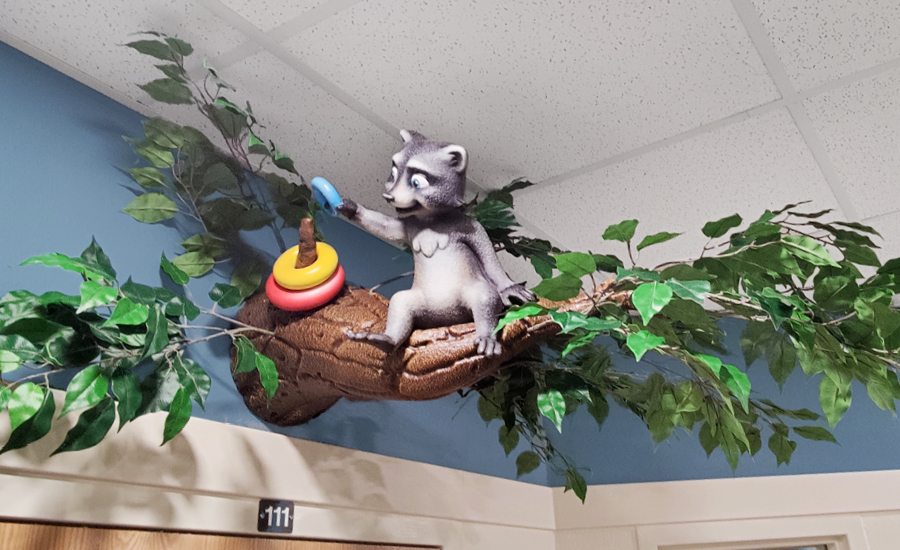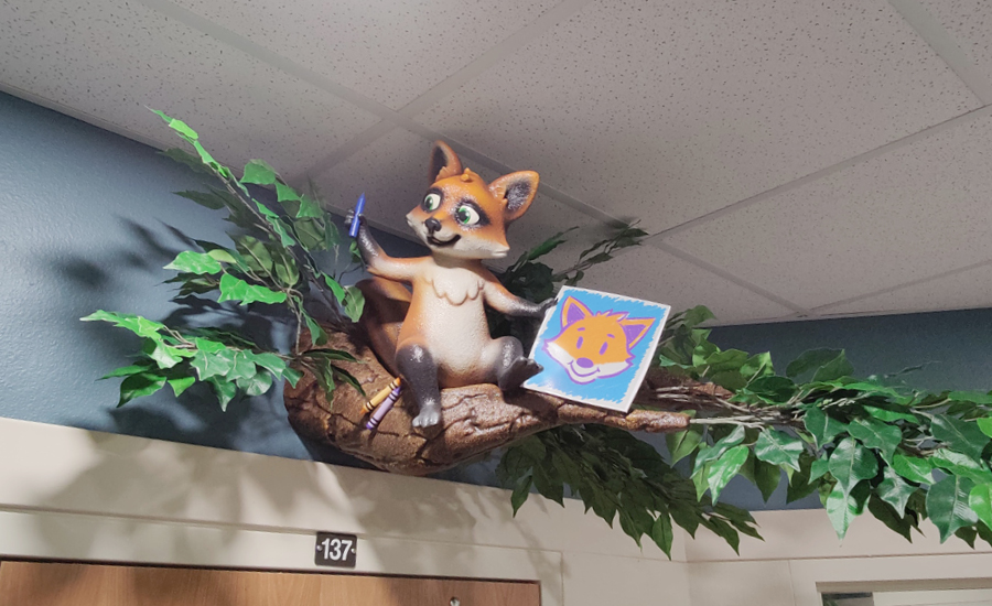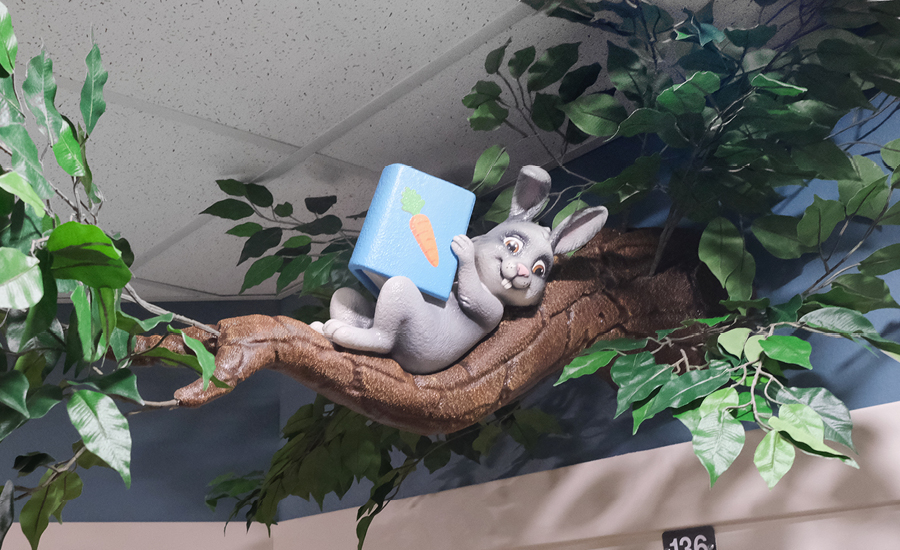 Each room in the child care center was given a custom baby animal adorning the entrance. From a fox drawing with crayons, a bunny engrossed in a book, to a skunk taking a nap beneath a charming mushroom mobile, these delightful characters greet children as they enter their respective rooms. These playful and imaginative elements set the stage for a day filled with discovery and creativity.