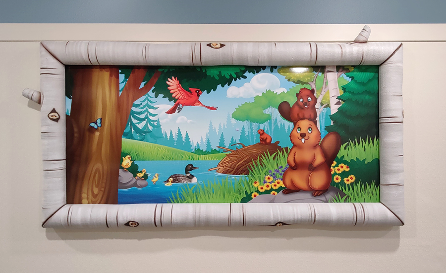 Faux windows along the halls display forest landscapes, complete with birch tree frames.