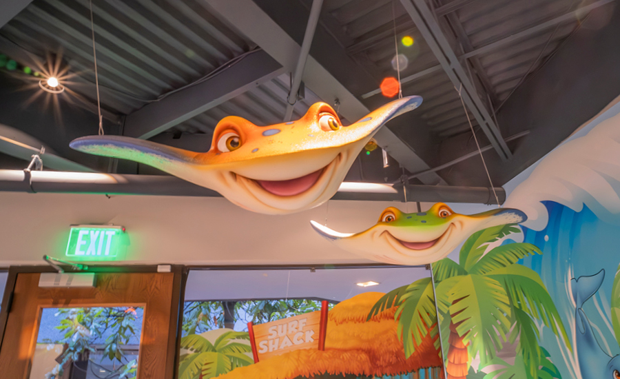 The reception area feels like a breezy boardwalk, with a rustic themed reception desk. Overhead, a friendly orca, fish and stingrays glide through the waves, making check-in a truly immersive experience. Fun signage guides young explorers to the “Kids’ Play” area, where an interactive, ocean-inspired space awaits. Beyond the wave tunnel, the undersea world comes to life with a sunken pirate ship play area, filled with colorful coral, playful fish, and a bright yellow slide leading straight into the deep blue.