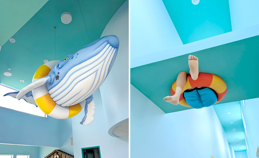 The airy seafoam ceilings, coastal colors, and wide-open layout feel like a calming shoreline. And floating overhead? A larger-than-life whale cruising through the lobby like it owns the place—because, honestly, it kind of does. The interior decor and lighting keeps the vibe polished and professional while still feeling like an undersea adventure with the added themed decor.