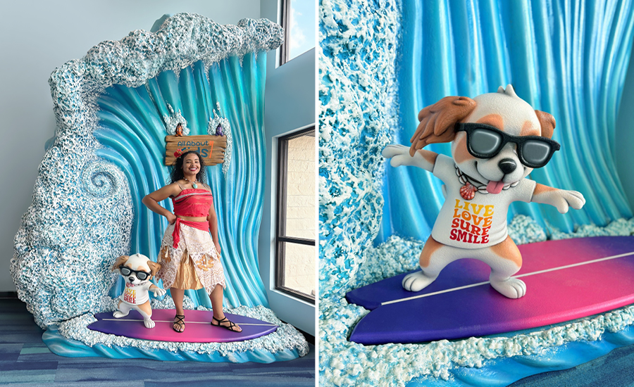 Over in the waiting space, the theme really leans into play. The showstopper is the photo-op wave, complete with a surfboard stage, ready for post-appointment victory pics (parents love proof of bravery). This is exactly what themed photo opportunities are made for: turning “We did it!” into a share-worthy moment that boosts smiles and your social feed. And then there’s the star: their dog mascot, striking a surf stance in sunglasses like the chillest little lifeguard on duty.
