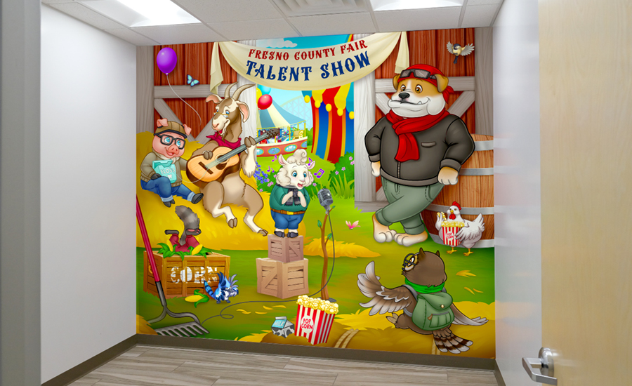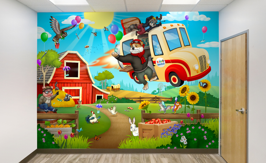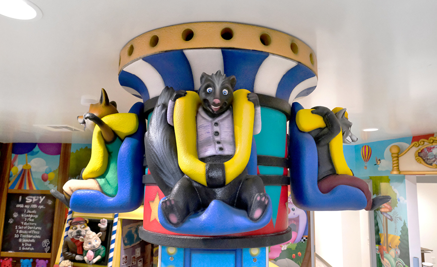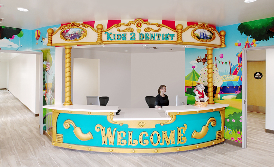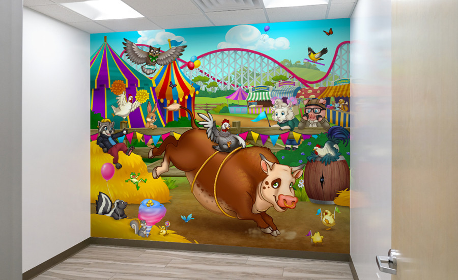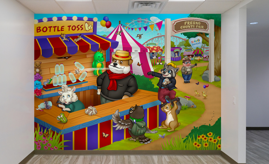 This lively carnival-themed dental office takes fun to the next level, starring the same beloved mascots from the client’s farm-themed office in a brand-new adventure. Patients are transported straight to the County Fair, where friendly characters set the stage for an exciting and cheerful visit.