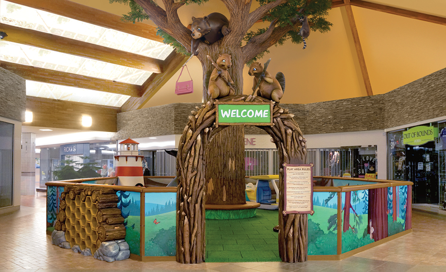 Experience a themed environment transformation in this indoor play area—designed like a treehouse with cartoon squirrels, raccoons, forest panels, and benches—for the perfect before and after adventure inside the shopping mall.