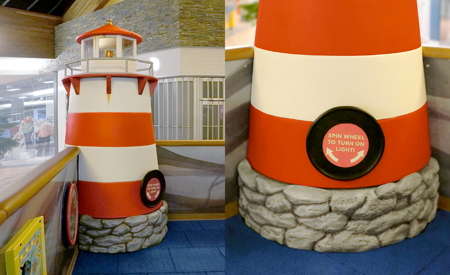 Children can crawl through a Softplay log tunnel, climb a Softplay bear, and test their coordination at the bead maze built into a sculpted tree stump. A lounging grizzly invites friendly encounters, while an interactive lighthouse provides hands-on fun.