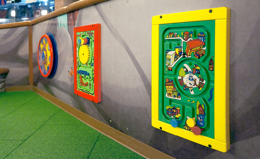 Wall-mounted panels offer quieter, skill-based play, encouraging fine motor development and problem-solving. All flooring is soft play surfacing, ensuring safe landings for every leap, skip, and tumble.