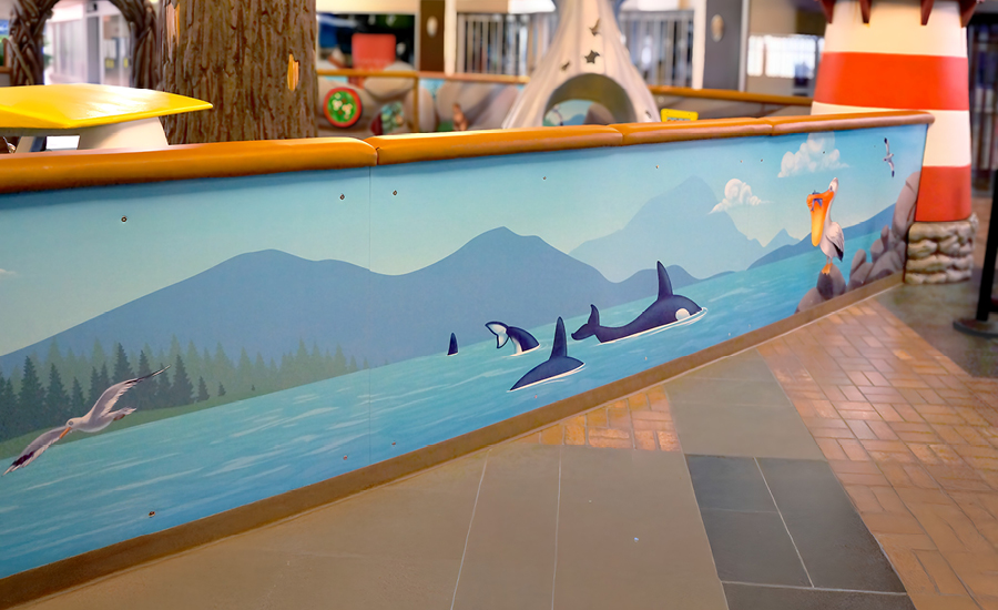 • Themed murals along the perimeter depict forest and coastal landscapes, expanding the sense of adventure.