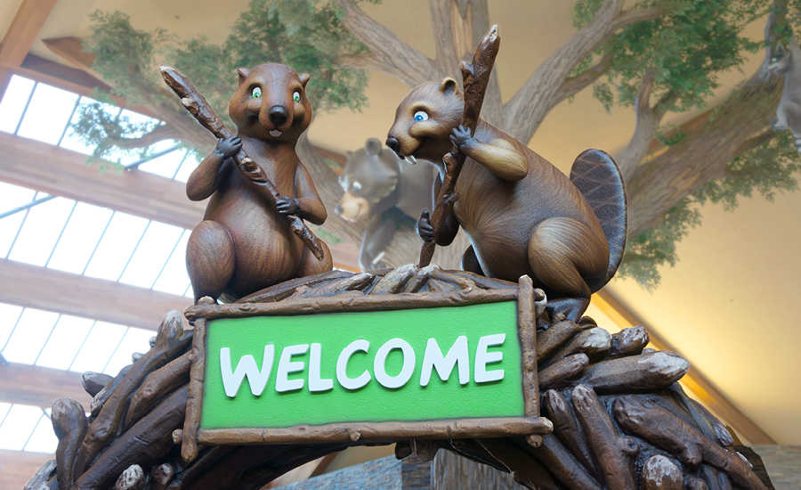 Families enter through a rustic beaver dam archway, where two cheerful beavers welcome children into the play space. At the center, a towering stylized tree stands tall, with playful critters perched in its branches keeping watch over the fun.