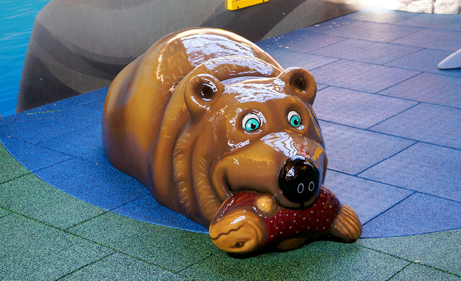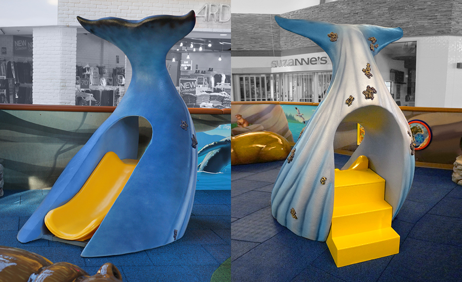 • A sculpted whale tail slide provides a gentle ride from its curved tail fin.