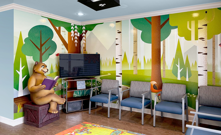 The charming waiting room is walled with vibrant murals that will transport guests down an inviting forest trail. It is along this path they are sure to run into a friendly brown bear named “Honey Bear” (named by the patients in an online contest) reading her favorite story. She loves it when explorers take a moment to pause and listen to her read. But her favorite thing is when visitors snap a photo with her.