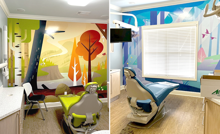 When patients are ushered into their appointment, any anxieties are sure to be eliminated as they settle into their treatment chair and gaze upon the breathtaking contemporary wall murals. The warm hues of the art in the open bay treatment area are sure to relax and transport visitors into a golden enchanted retreat. The private treatment rooms have beautiful landscapes as well.