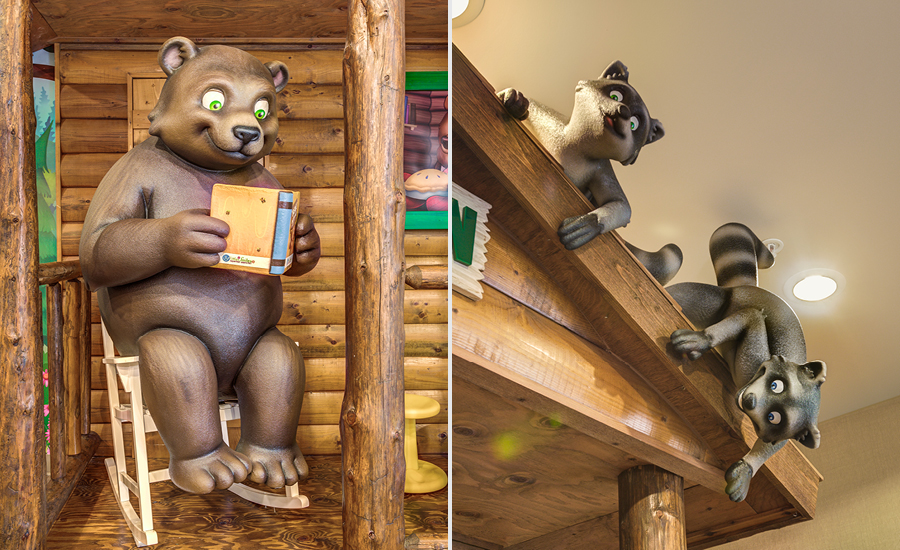 Across from reception desk they will find wall-to-wall woodland murals filled with foliage and illustrations of friendly animals. This pediatric office had an existing cabin façade for kids where we were able to add a cute sculpted bear character reading a book and a pair of 3D raccoons playfully peeking down from the roof of the cabin.