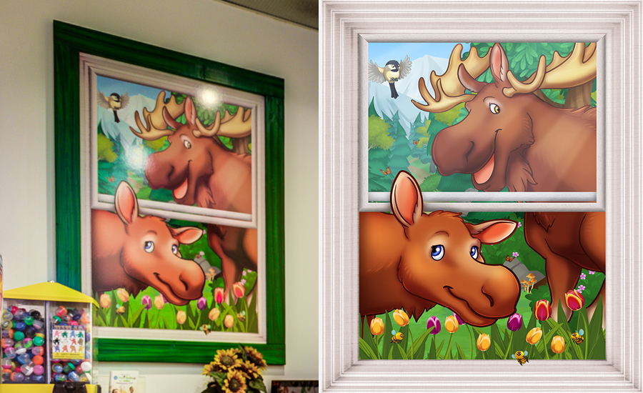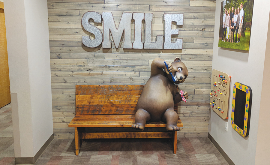 A faux window features two curious moose peering into the office. Nearby, a bench photo op with a bear character holding a tube of toothpaste and brushing his teeth waits for patients to sit down for a photo. The dentist has created their own great signs for taking photos at the end of an appointment as a way to promote the office on social media.