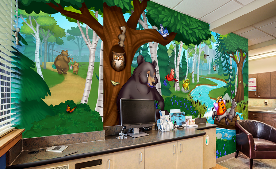 Children will love the faux window detail showing a mural of the cabin interior and another bear making a pie. In addition to the murals and 3D characters in the waiting room, there are Keebee game panels and wall mounted video game units to help pass the time waiting for appointments.